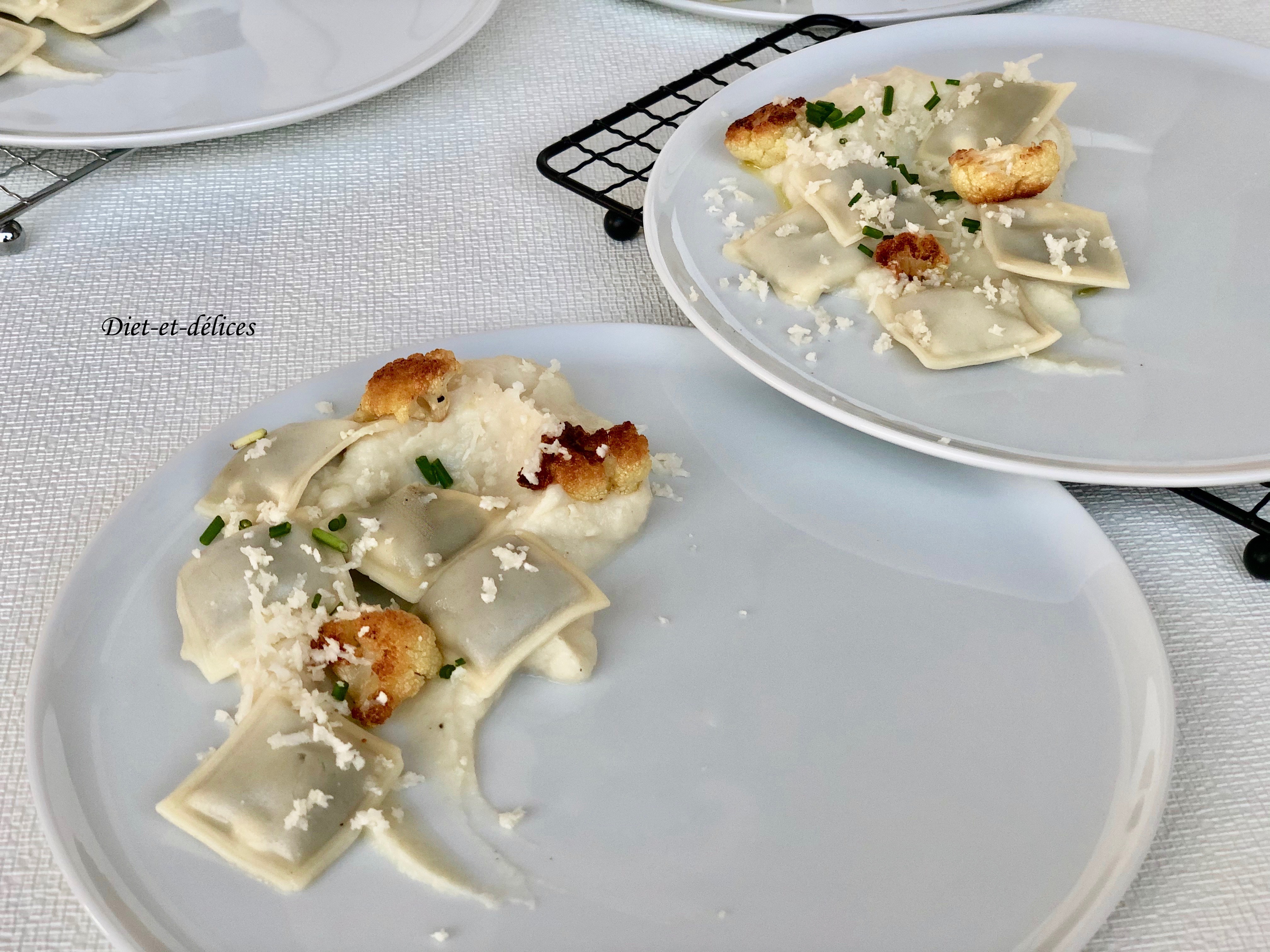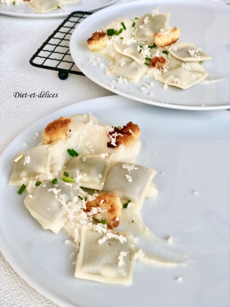 Du chou-fleur cuisiné sous différentes formes pour accompagner ces délicieuses ravioles : pourquoi pas une entrée pour Noël.