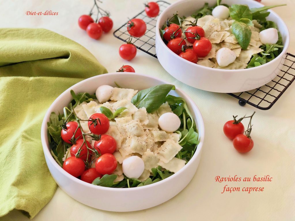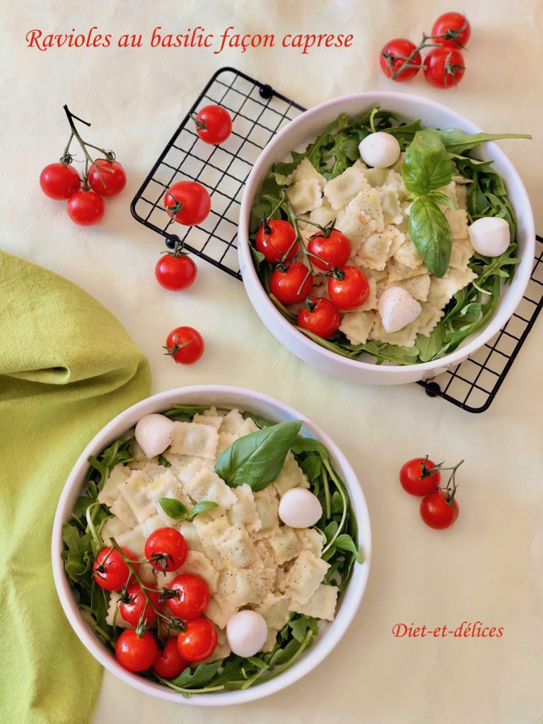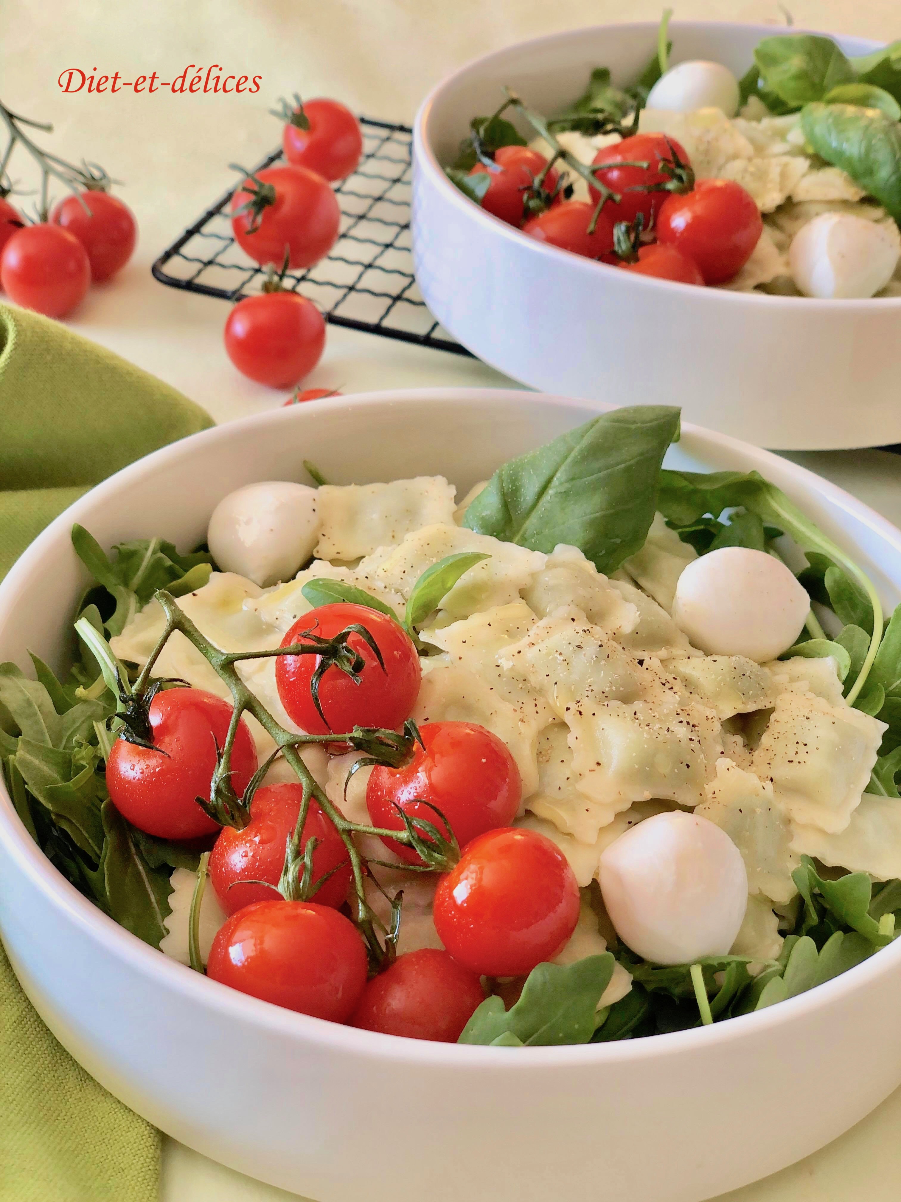 ravioles , ravioles au basilic, tomates cerisesmozzarella, végétarien, plat completravioles, ravioles au basilic, tomates cerisesmozzarella, roquette, plat complet