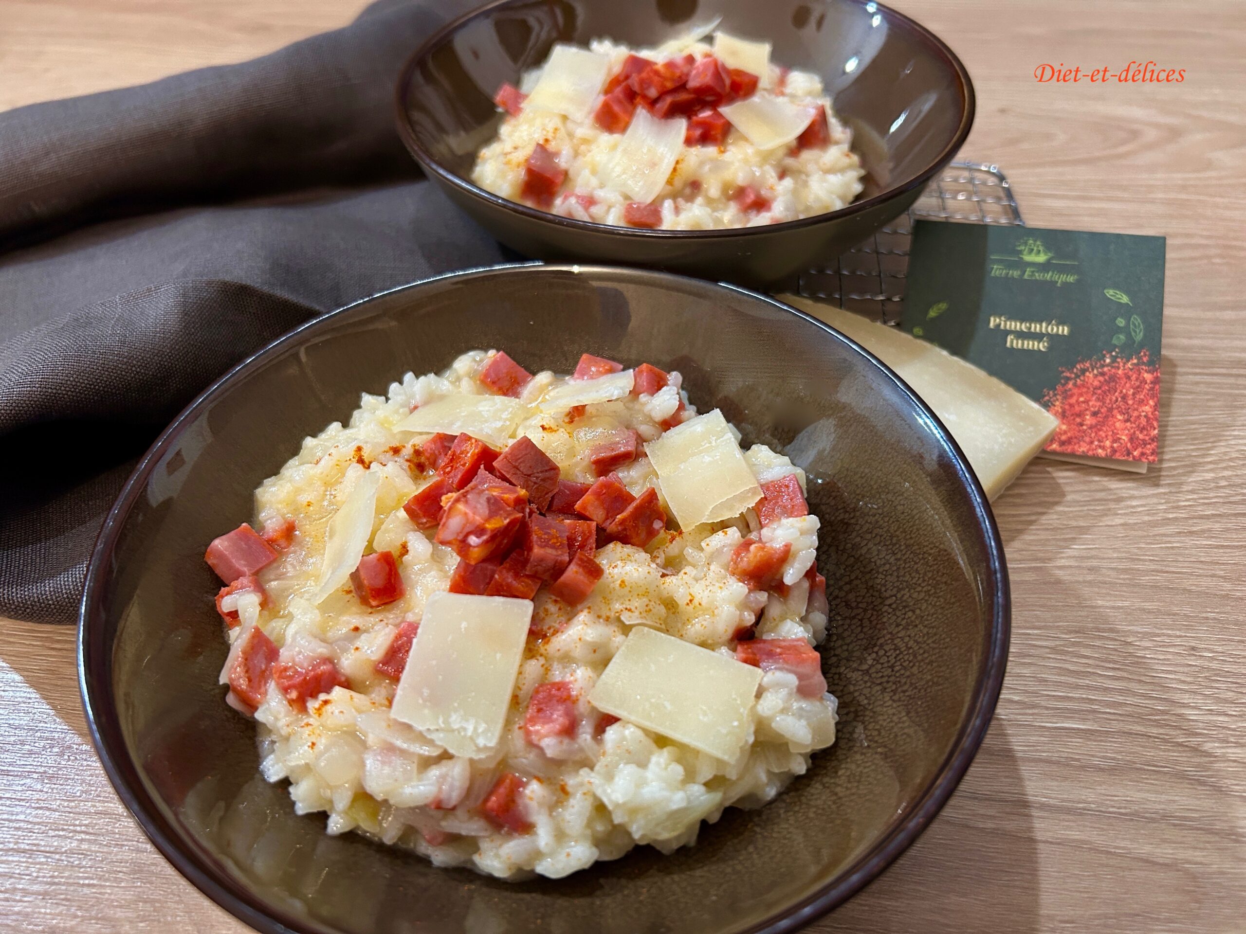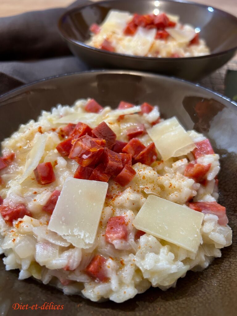 - En fin de cuisson, saler légèrement, poivrer, ajouter le parmesan, le pimentón fumé et les dés de chorizo. Faire « sauter » le risotto dans la casserole : cela s’appelle le monter à la vague. Dresser dans les assiettes et ajouter quelques copeaux de parmesan. Servir aussitôt.