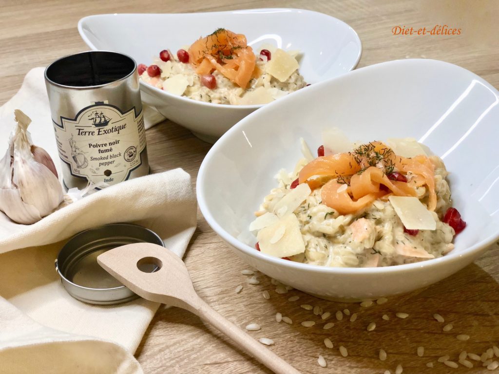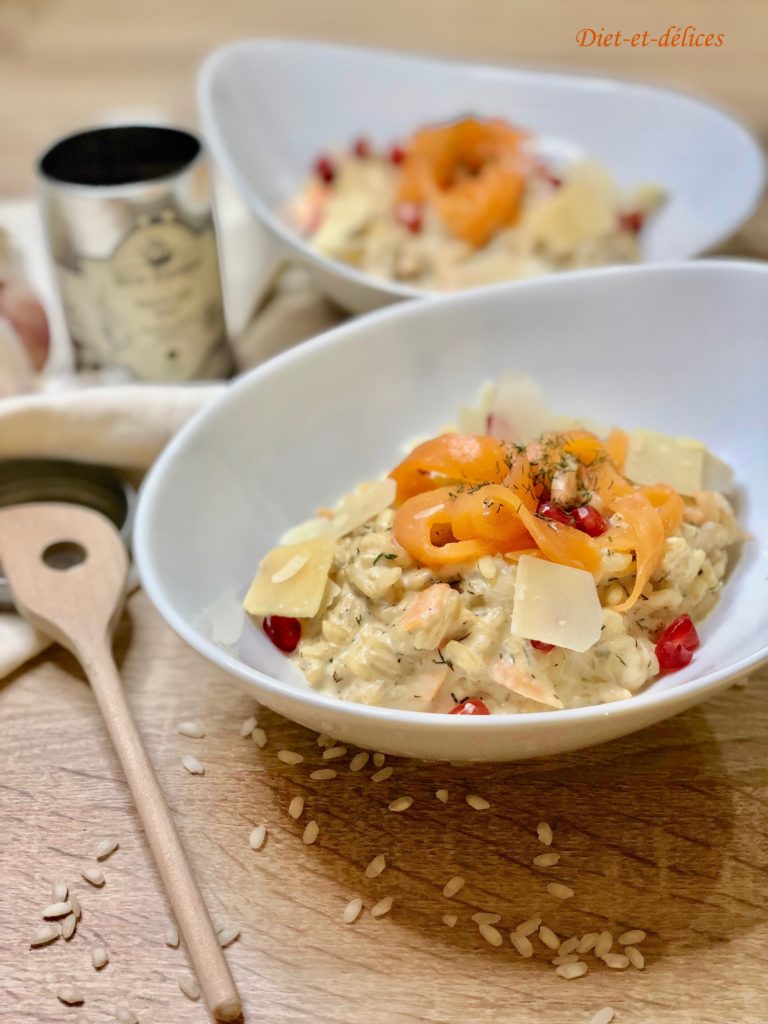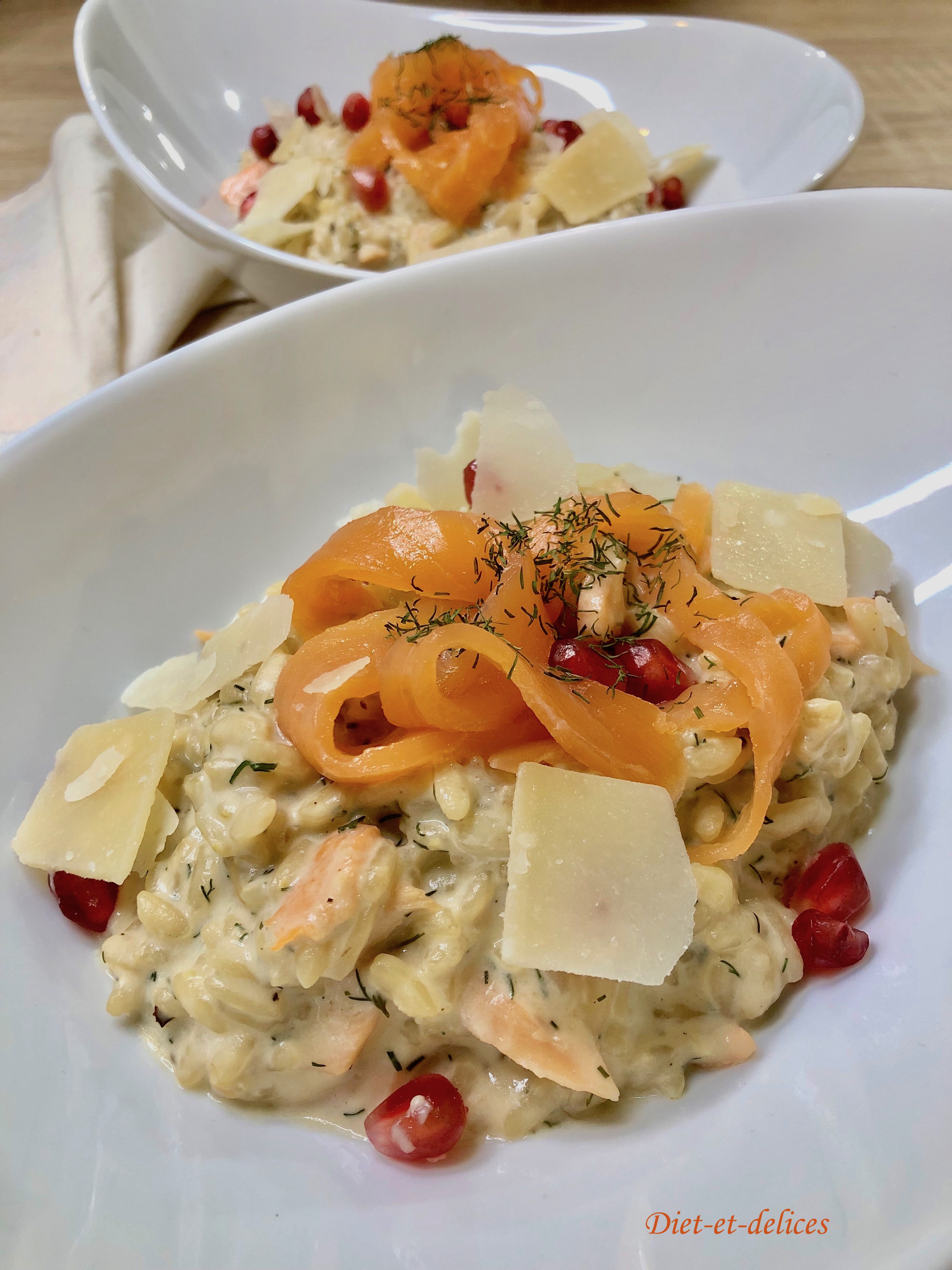 risotto, saumon, saumon fumé, risotto au saumon, riz, grenade, plat complet, parmesan, aneth