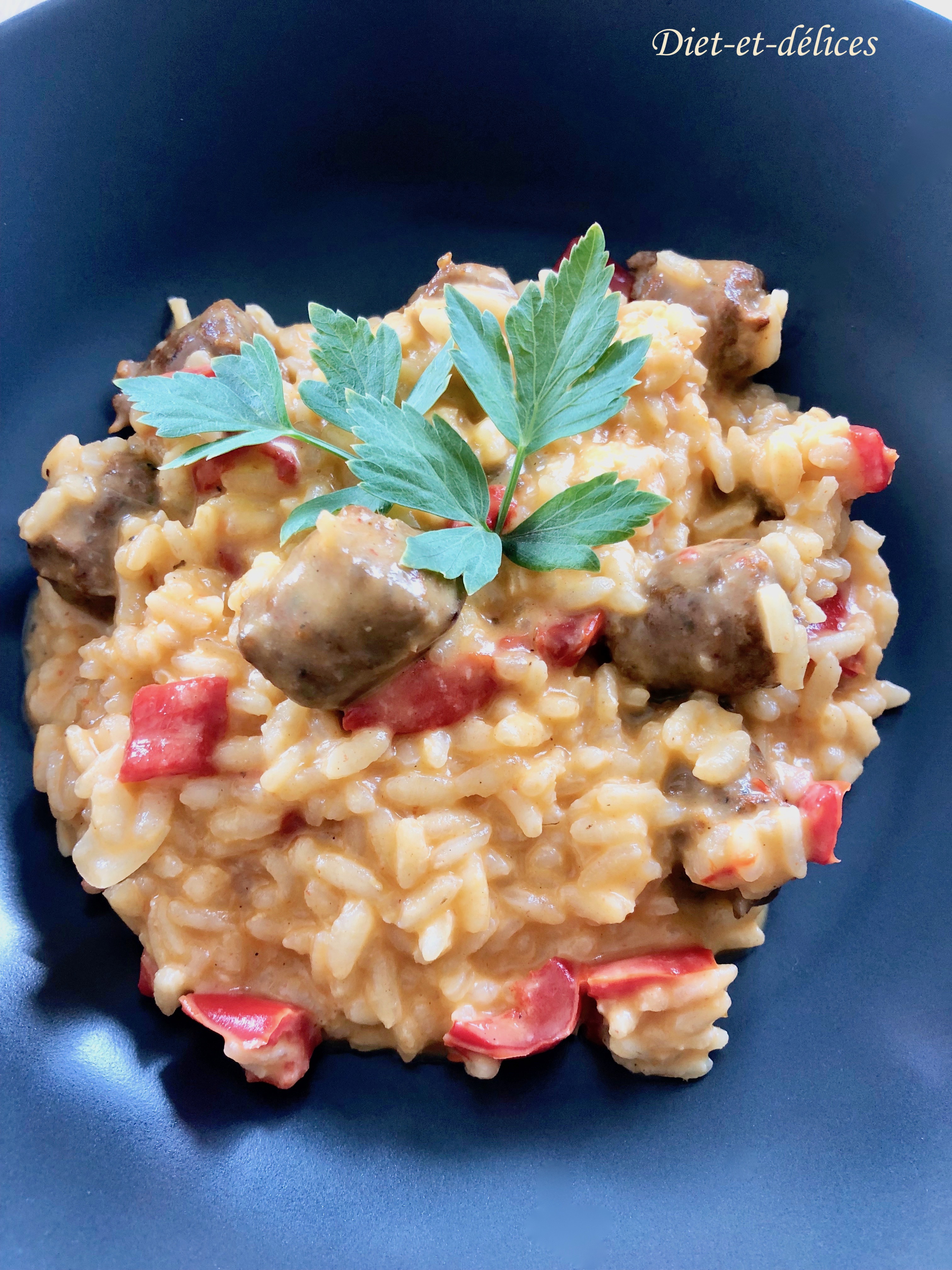 Un risotto savoureux et onctueux, aux bonnes saveurs relevées avec la merguez. Le choix de la couleur foncée des assiettes avec le risotto, met ce plat encore plus en appétit.