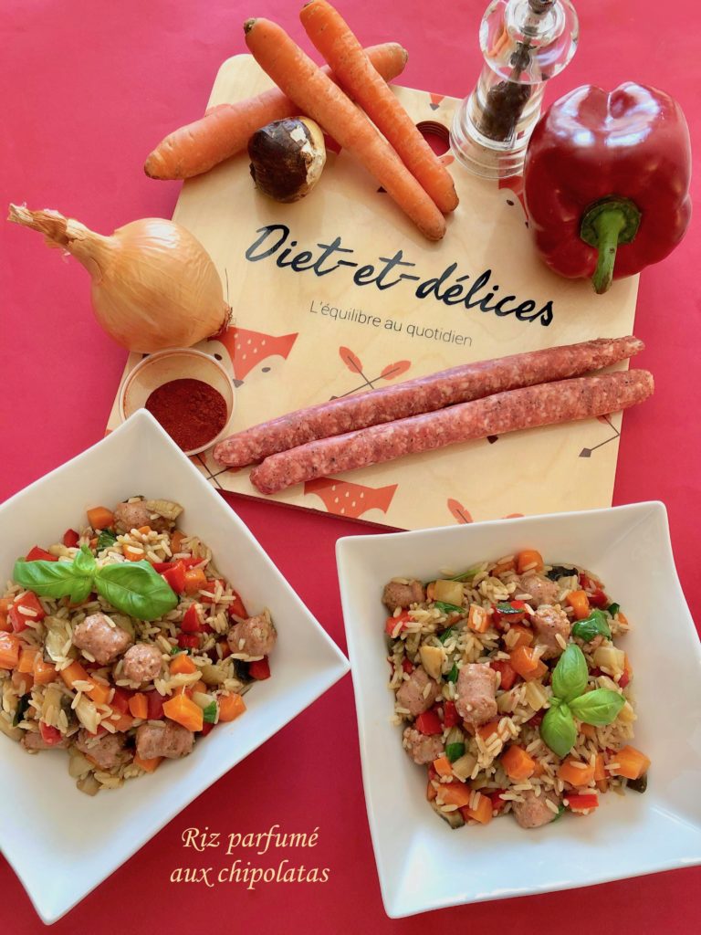 riz, plat complet, chipolata, poivron, carotte, paprika fumé