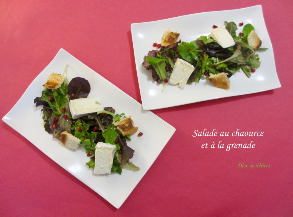 - Parsemer de grains de grenade. Ajouter trois gros croûtons sur chaque salade.