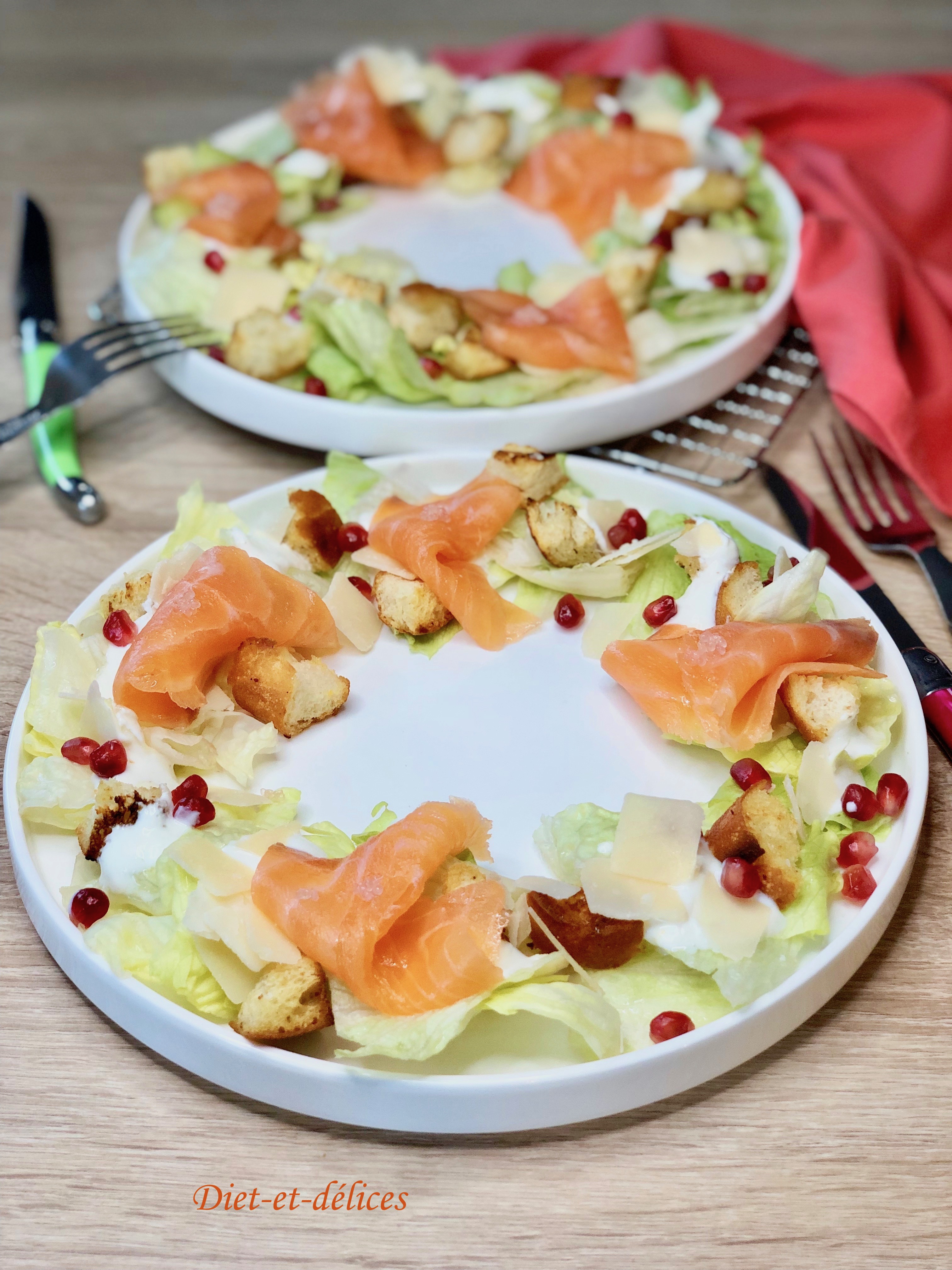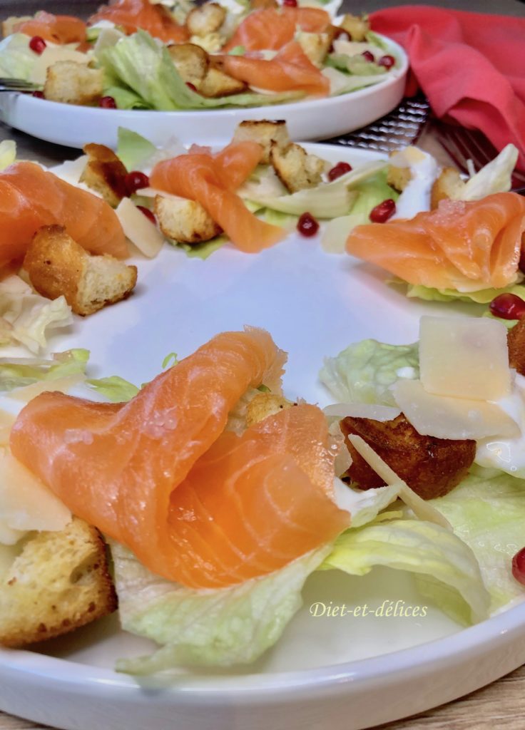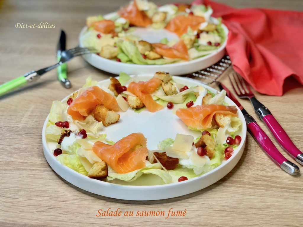 salade, salade composée, saumon, salade au saumon fumé, grenade, saumon fumé, parmesan, croûtons, plat complet