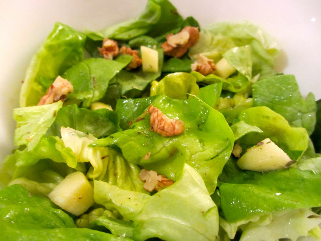 - Mélanger la laitue, la vinaigrette, les cerneaux de noix et les dés de pommes.