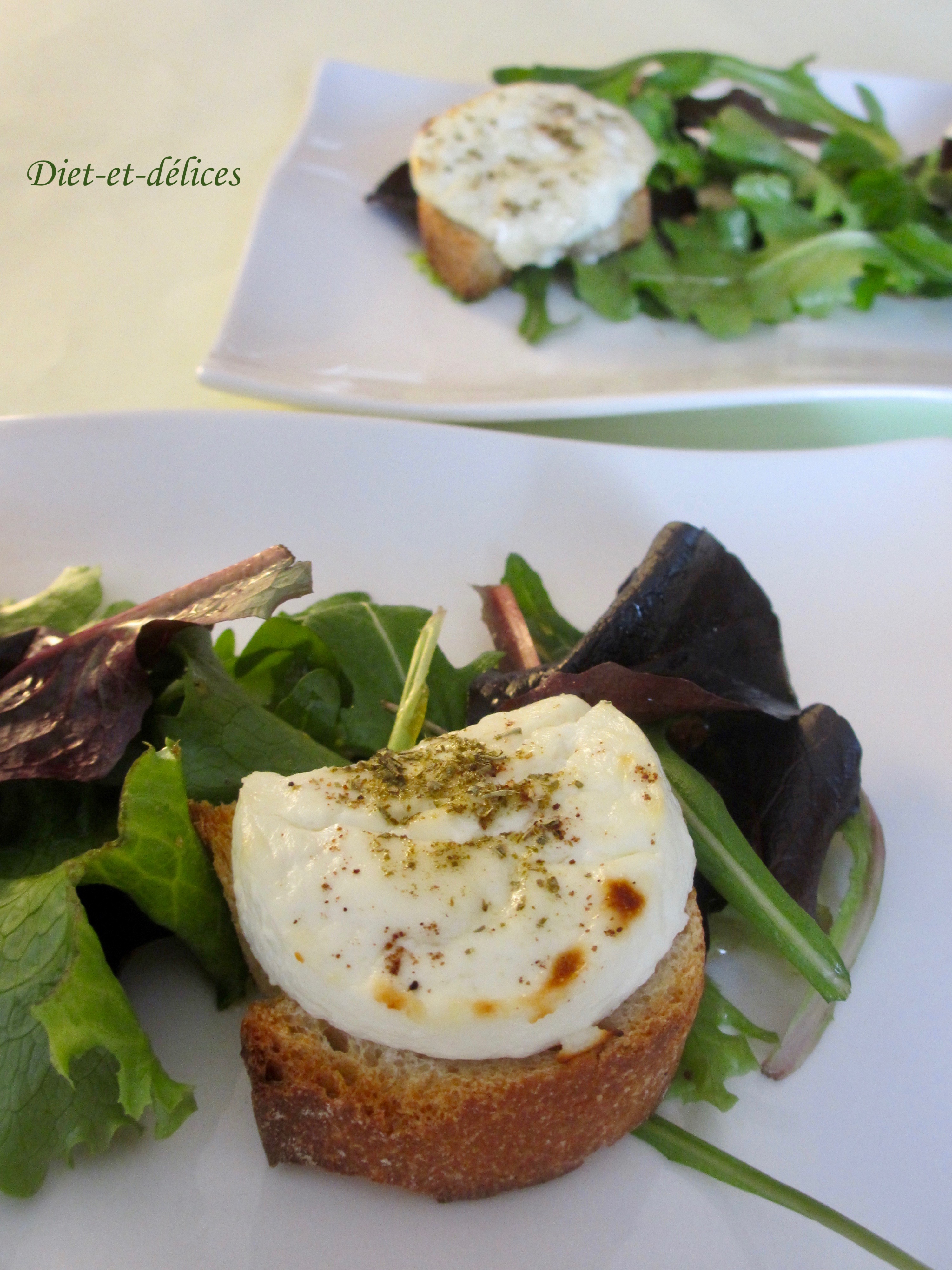 - Disposer délicatement deux toasts au fromage de chèvre sur chaque salade puis servir aussitôt.