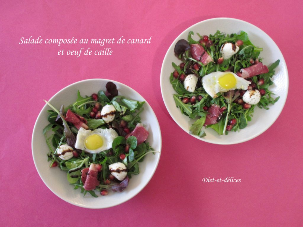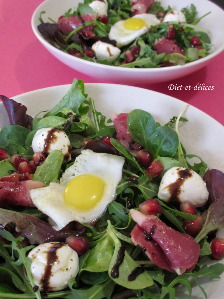 salade, magret de canard, oeuf de caille, salade composée, mozzarella, grenade