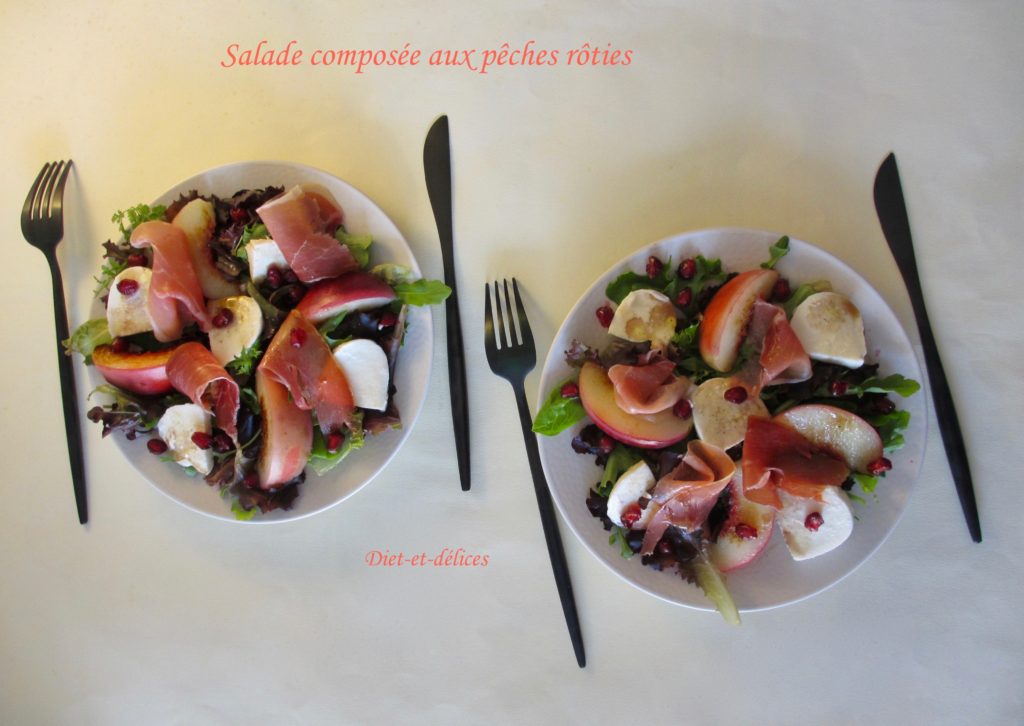 salade, sucré salé, pêches, salade composée, jambon cru, grenade, mozzarella, pêches rôties