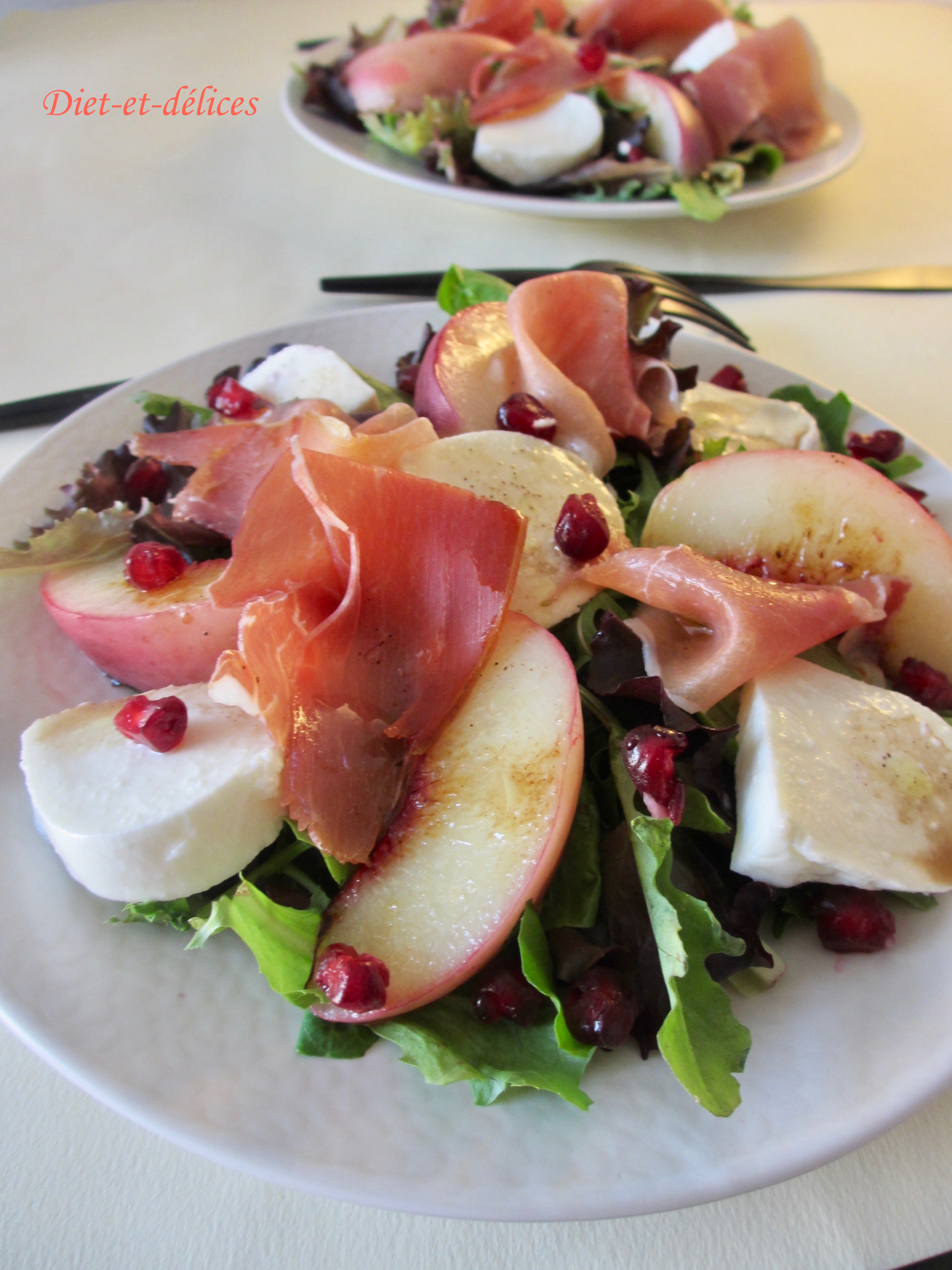 salade, salade composée, pêche, jambon, mozzarella, grenade, plat complet