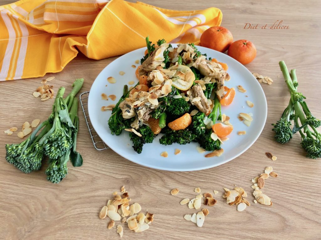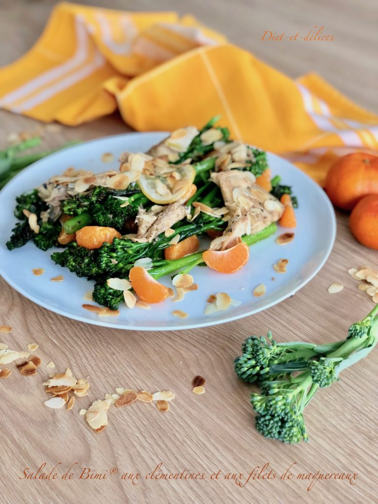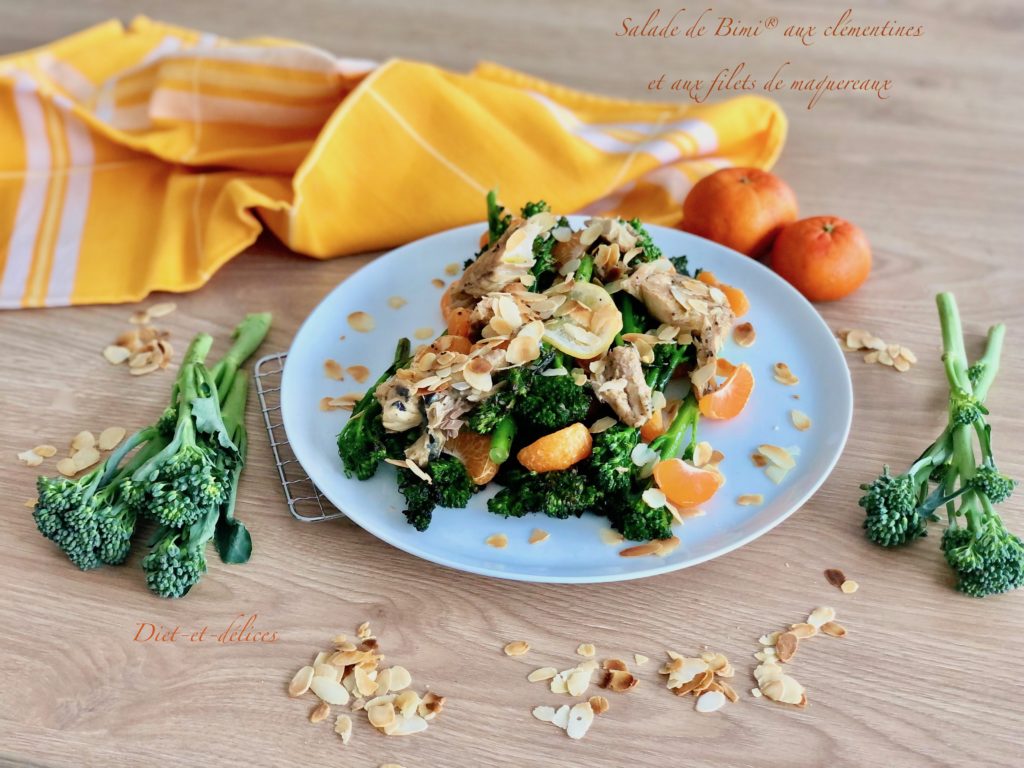 brocoli, brocoli bimi, maquereau, amandes effilées, clémentines, sucré salé