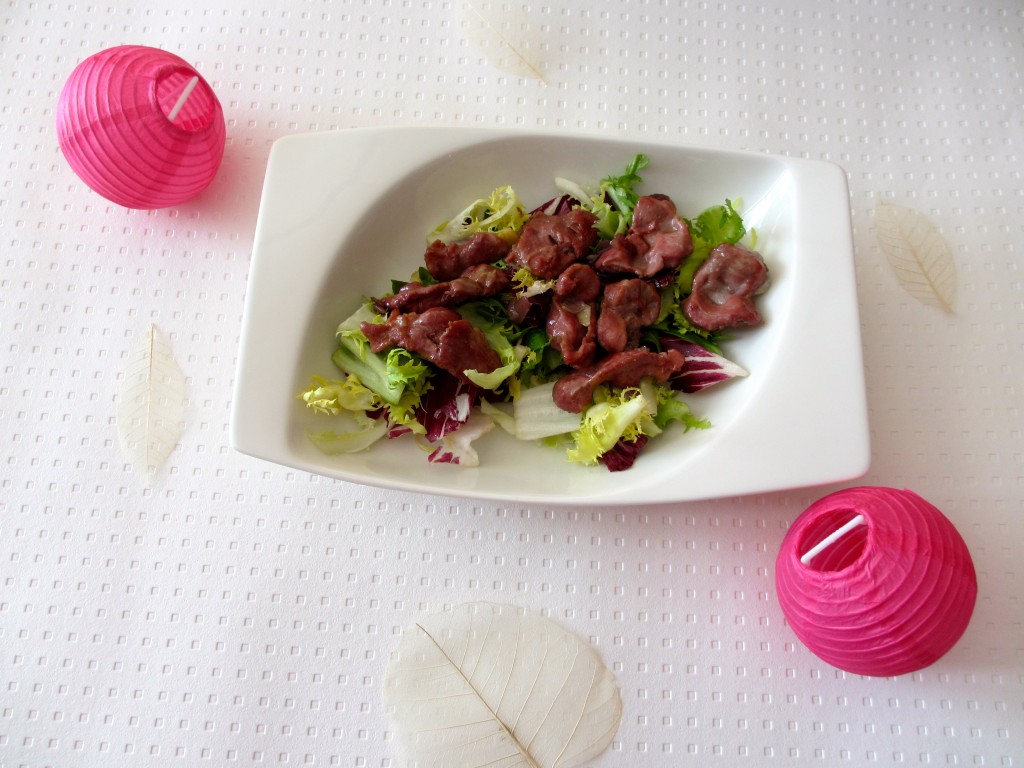 salade, salade de gésiers, gésiers, vinaigre de framboise,salade composée, salade de fête, ail, oignon rouge,salade gourmande