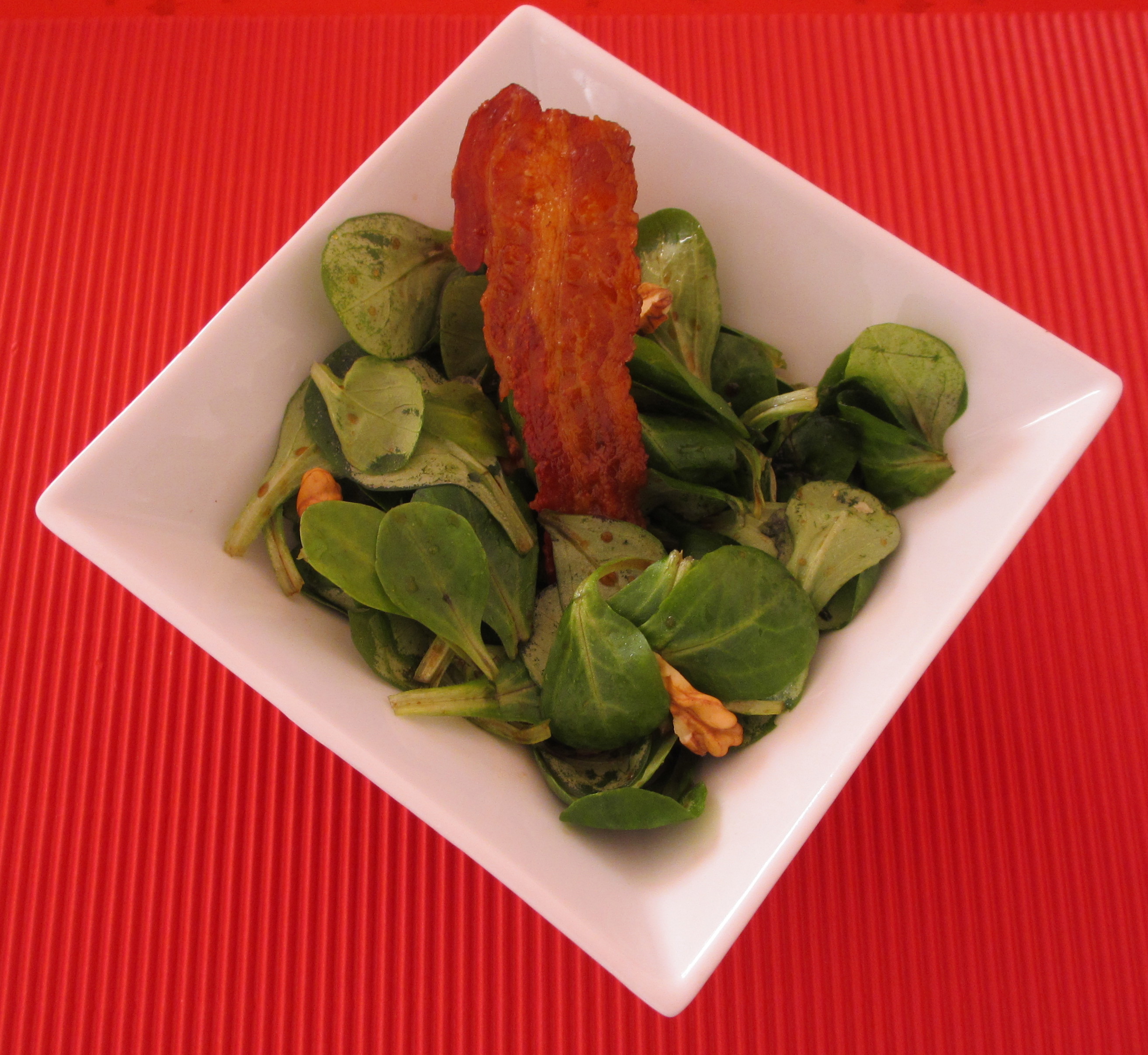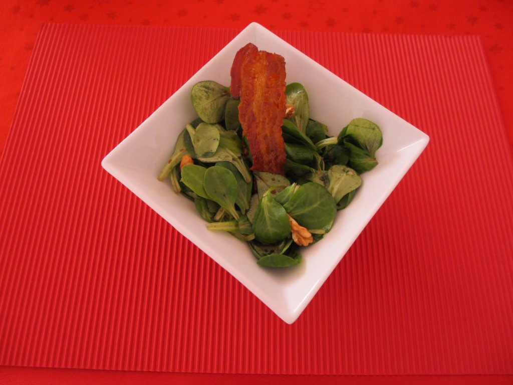 salade, mâche, salade de mâche,oméga 3, vinaigre de truffes, noix, lard, lard grillé, mâche aux noix,vinaigrette