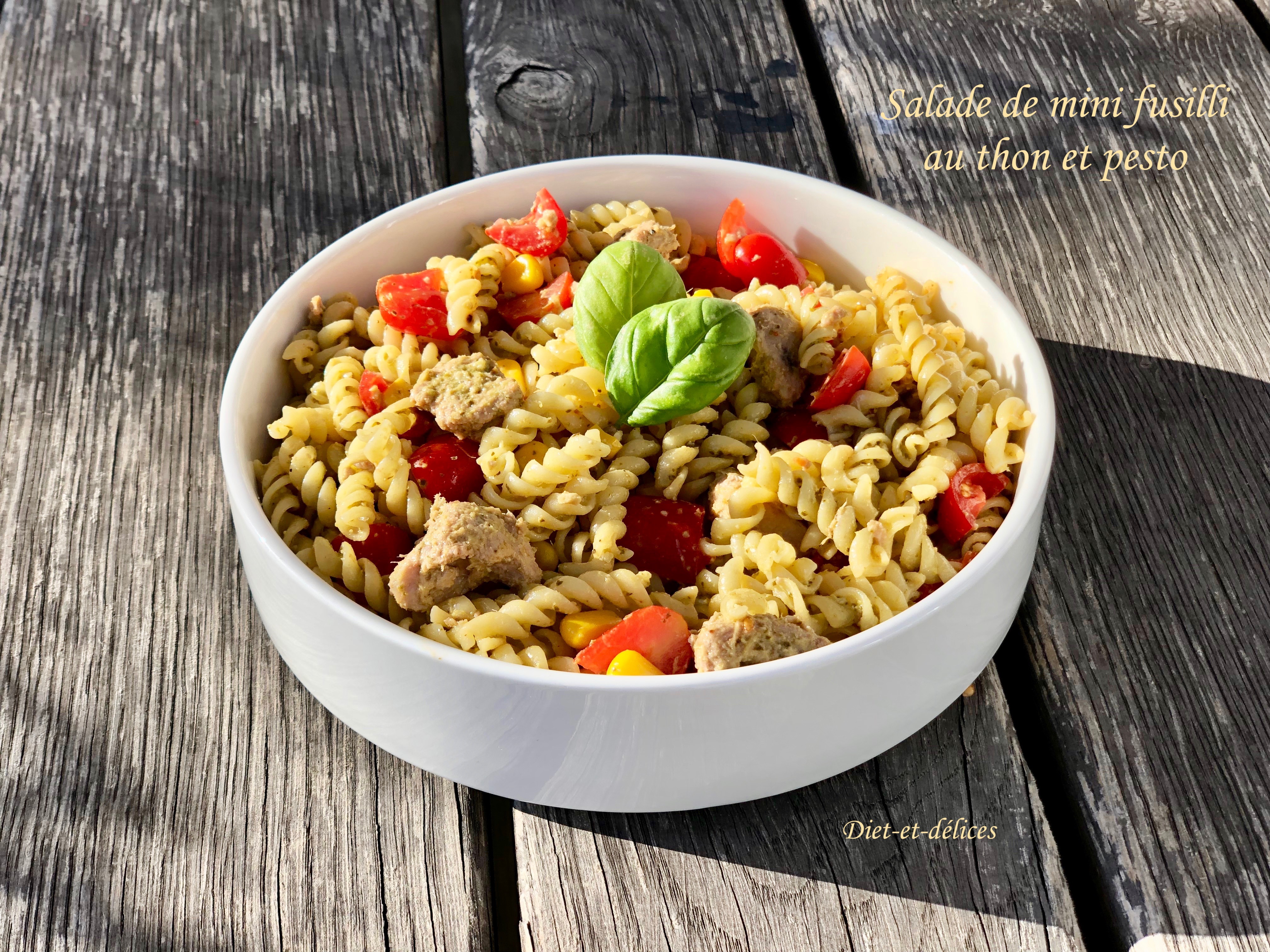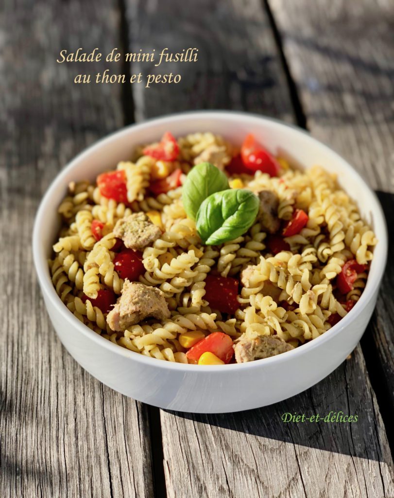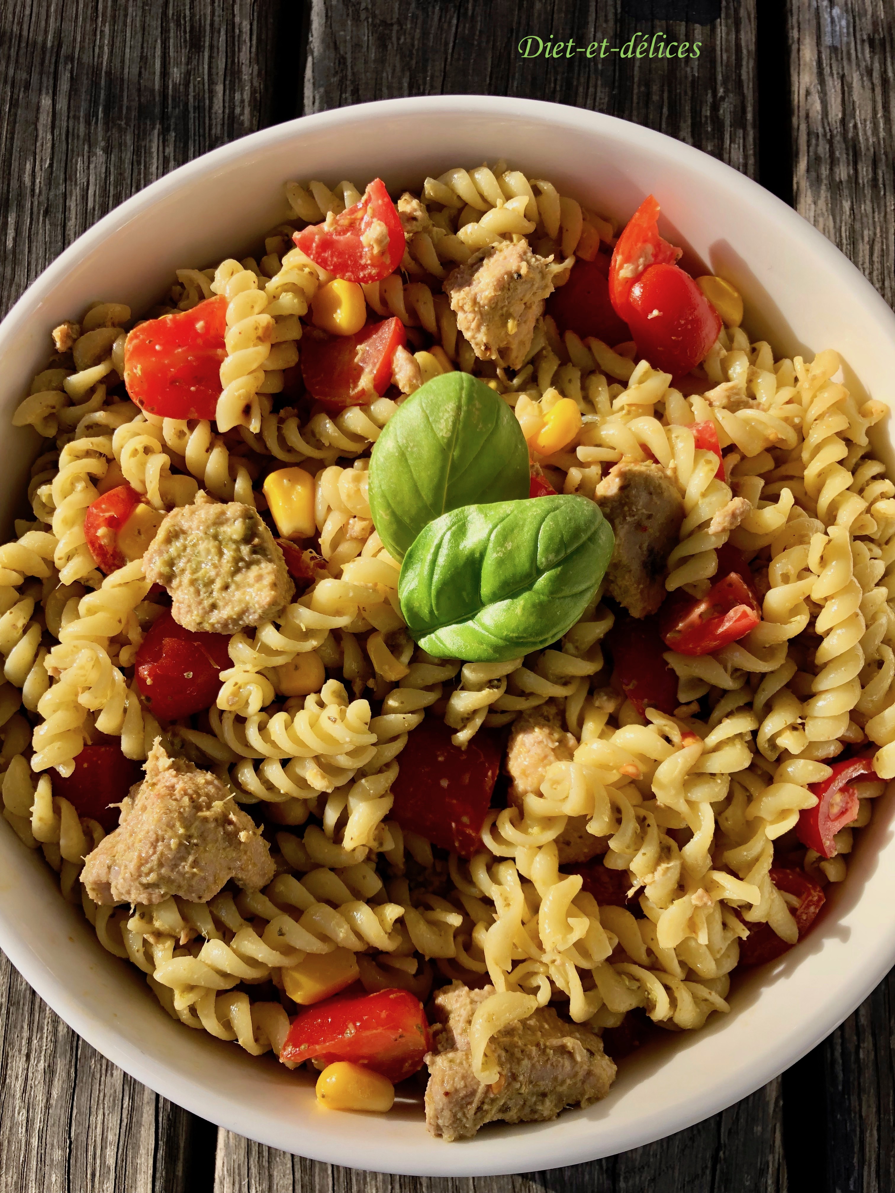 salade de pâtes, fusilli, thon, pesto, tomates cerises, maïs