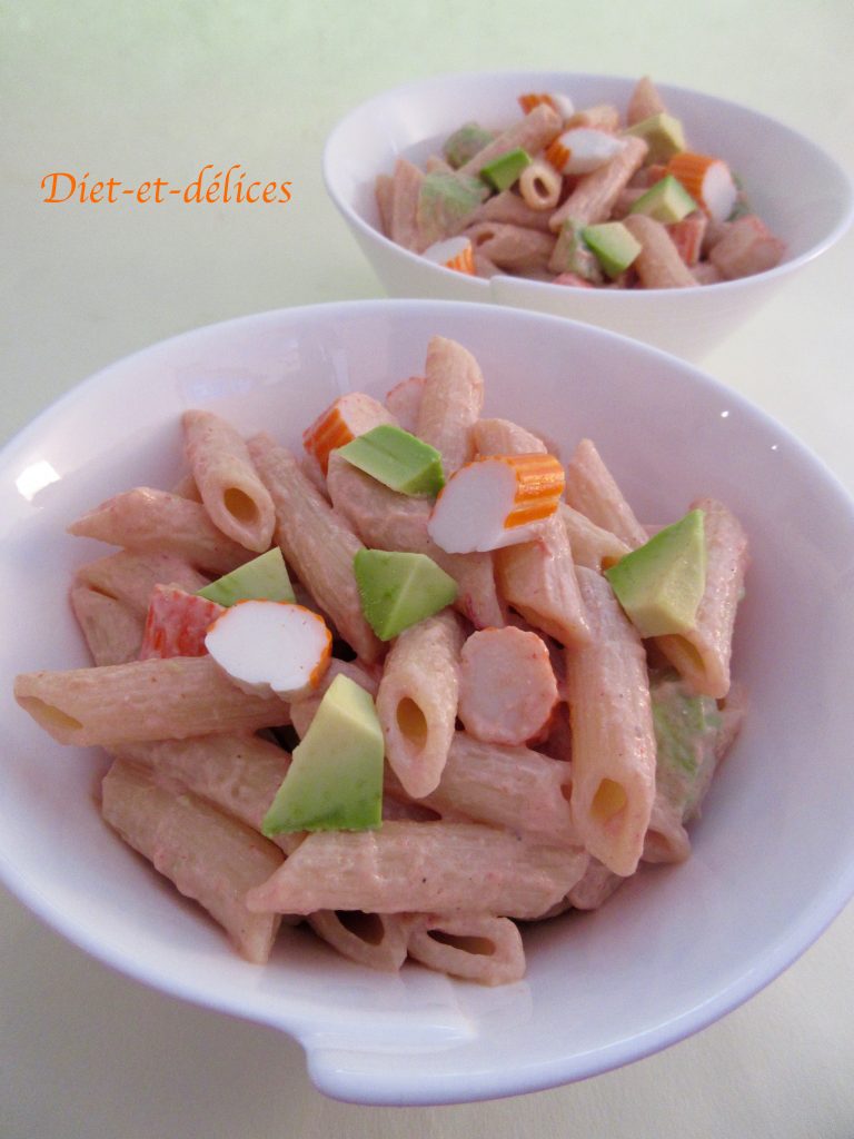 pâtes, salade de pâtes, surimi , pâtes à l’avocat, salade de pâtes à l’avocat, avocat , pâtes à l’avocat et surimi, sauce cocktail, féculents