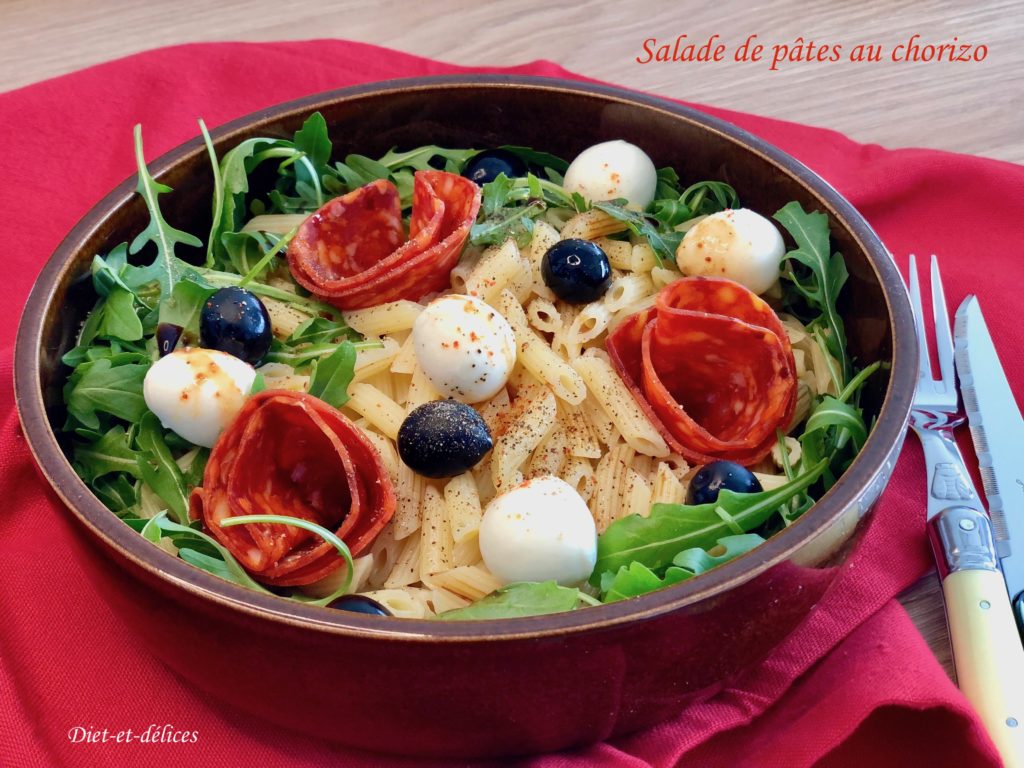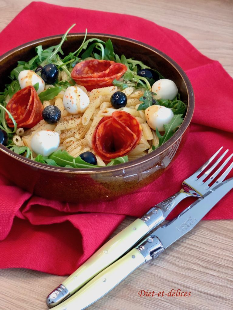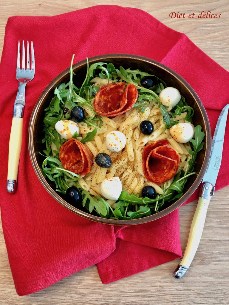 salade de pâtes, roquettes, pâtes, chorizo, mozzarella, olives noires, plat complet, penne