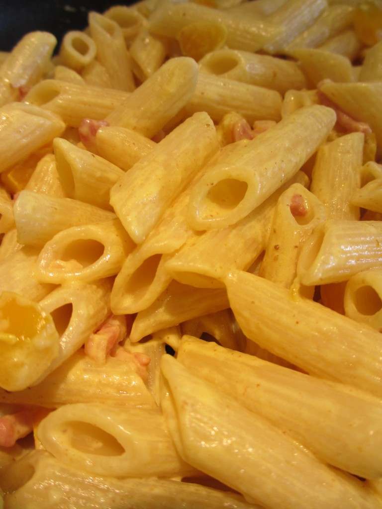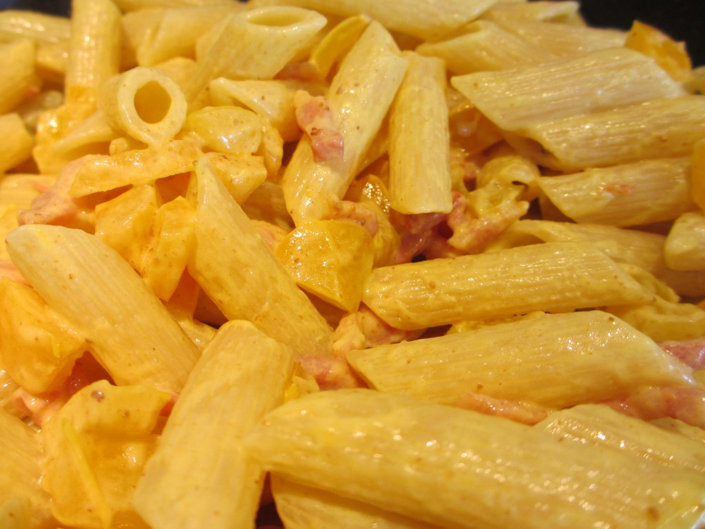 pâtes, penne, salade de pâtes, curry, poivrons, poivrons jaunes fromage frais, lardons, féculents, salade froide, accompagnement