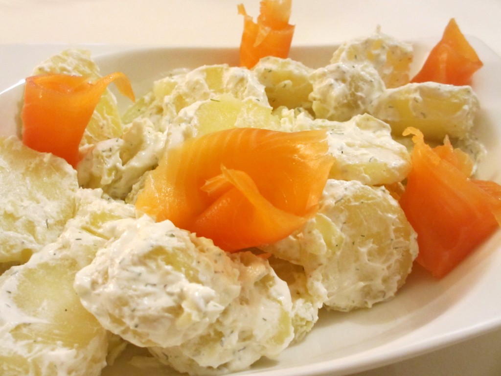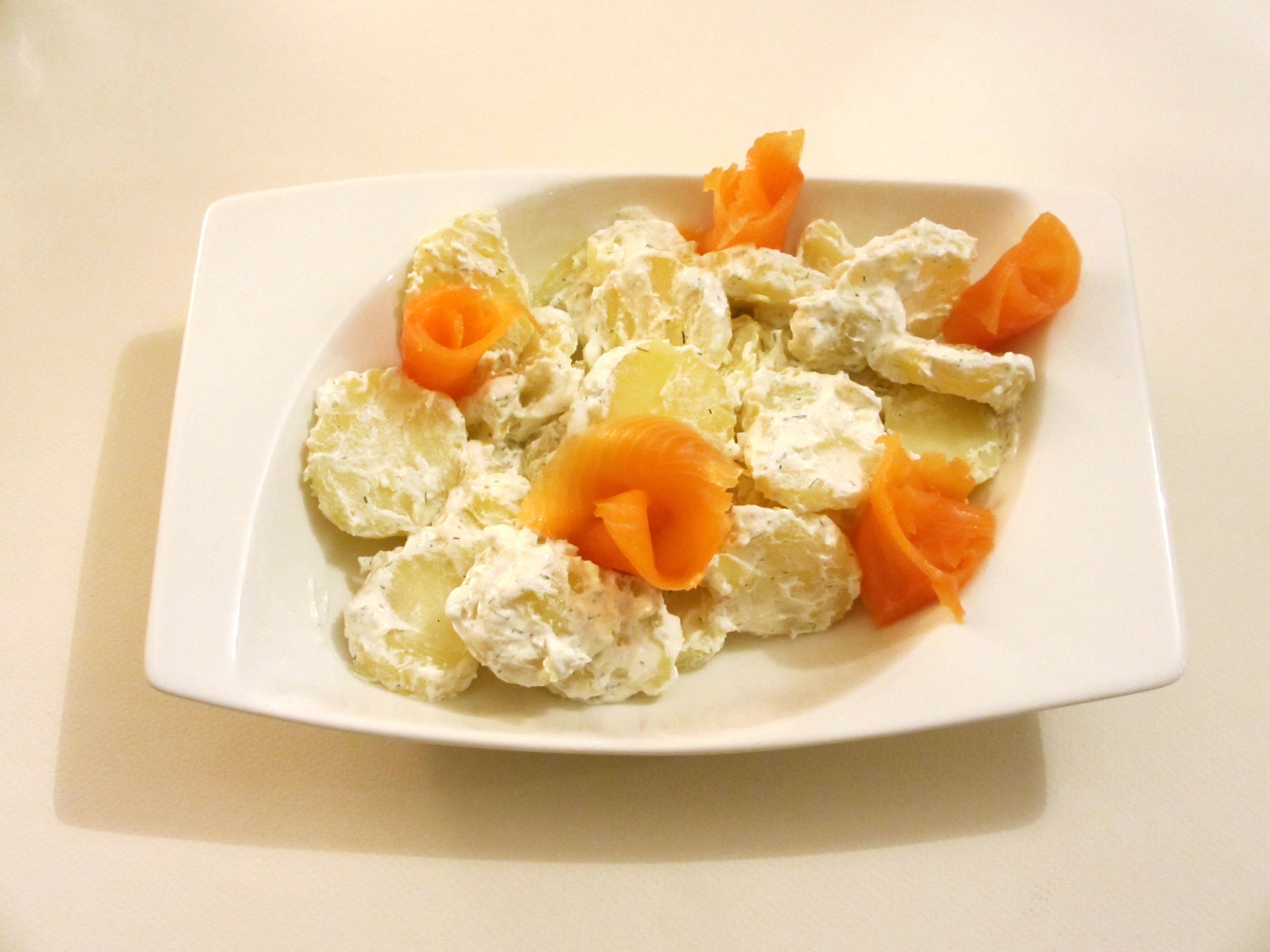 salade de pommes de terre, salade de pommes de terre à la truite, truite, féculents, salade de pommes de terre à la truite fumée, truite fumée, petits suisses, aneth,sauce au petit suisse, sauce allégée,accompagnement, poisson, pommes de terre en robe des champs