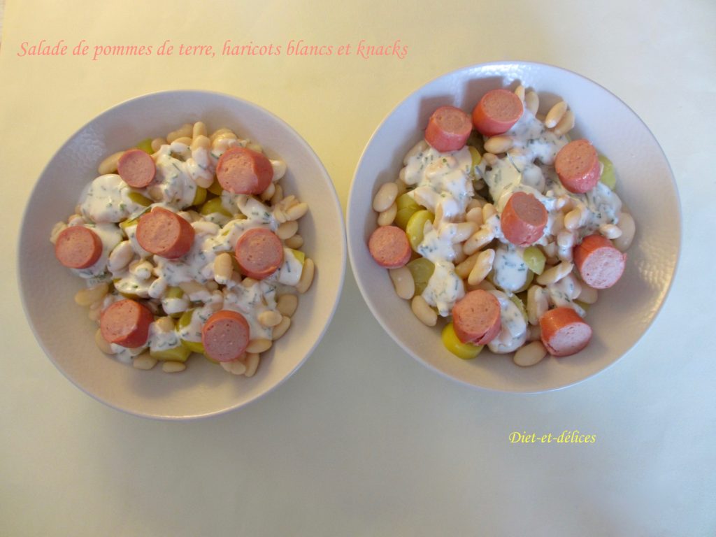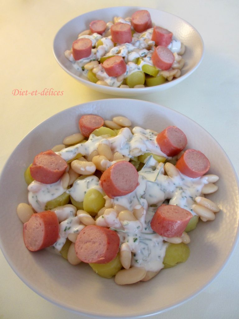 knack, saucisse de Strasbourg, pommes de terre, salade, fromage blanc, haricots blancs