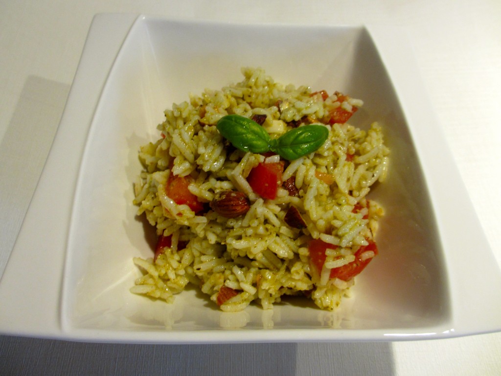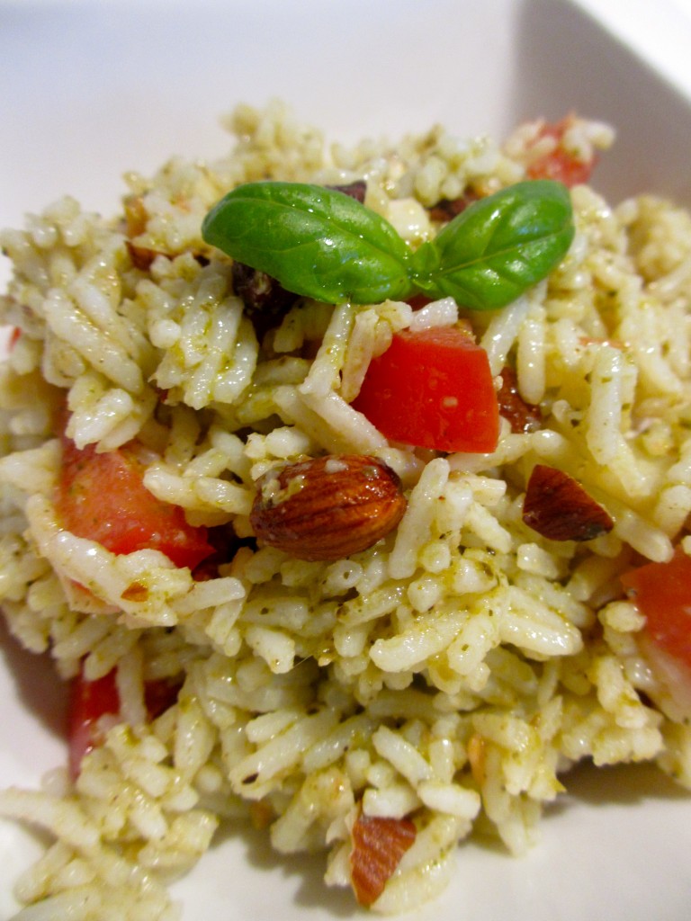 riz, riz au pesto,pesto, salade de riz, amandes, tomate, basilic,accompagnement, plat froid, riz cuit, ail confit,féculents , riz, salade de riz,pesto, riz au pesto, tomates, amandes, basilic,accompagnement, féculents, ail confit, ail