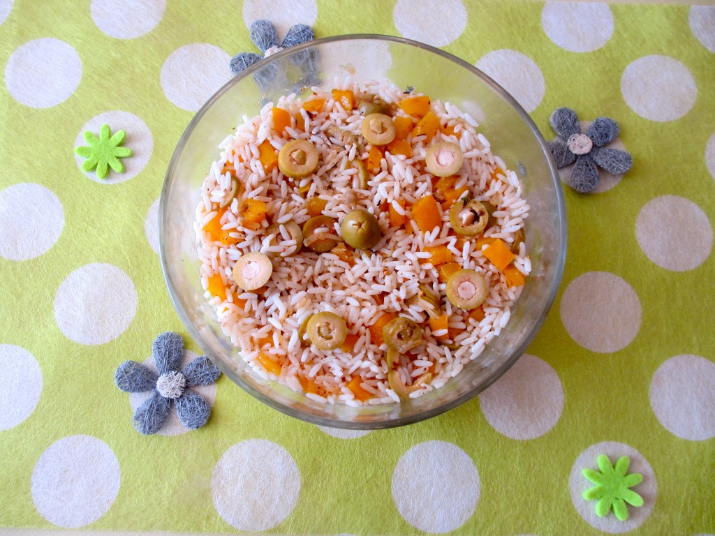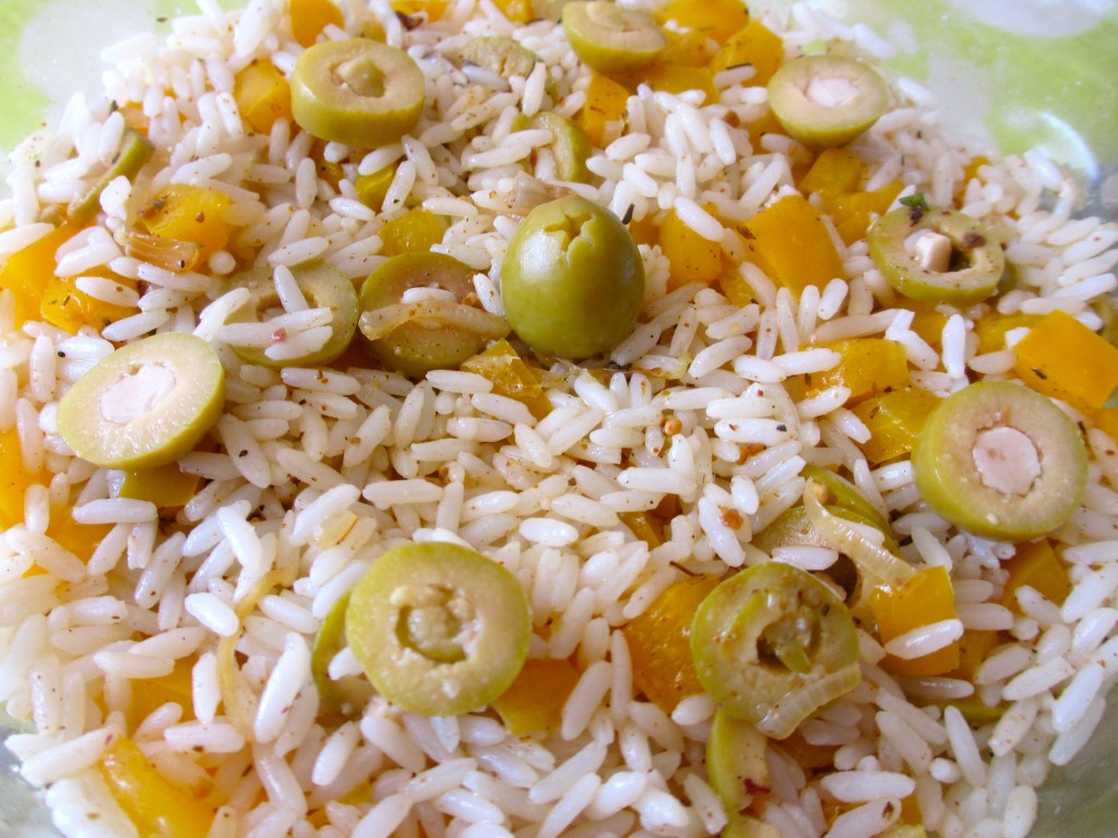 salade de riz, riz,barbecue, pique nique, olives, cajun, poivron,poivron jaune, salade de riz aux poivrons,féculents, accompagnement, accompagnement froid, épices, salade