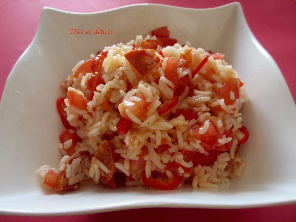 - Verser le riz dans un saladier puis y ajouter les dés de chorizo, de poivrons, de tomates. Saler, poivrer et ajouter le paprika.