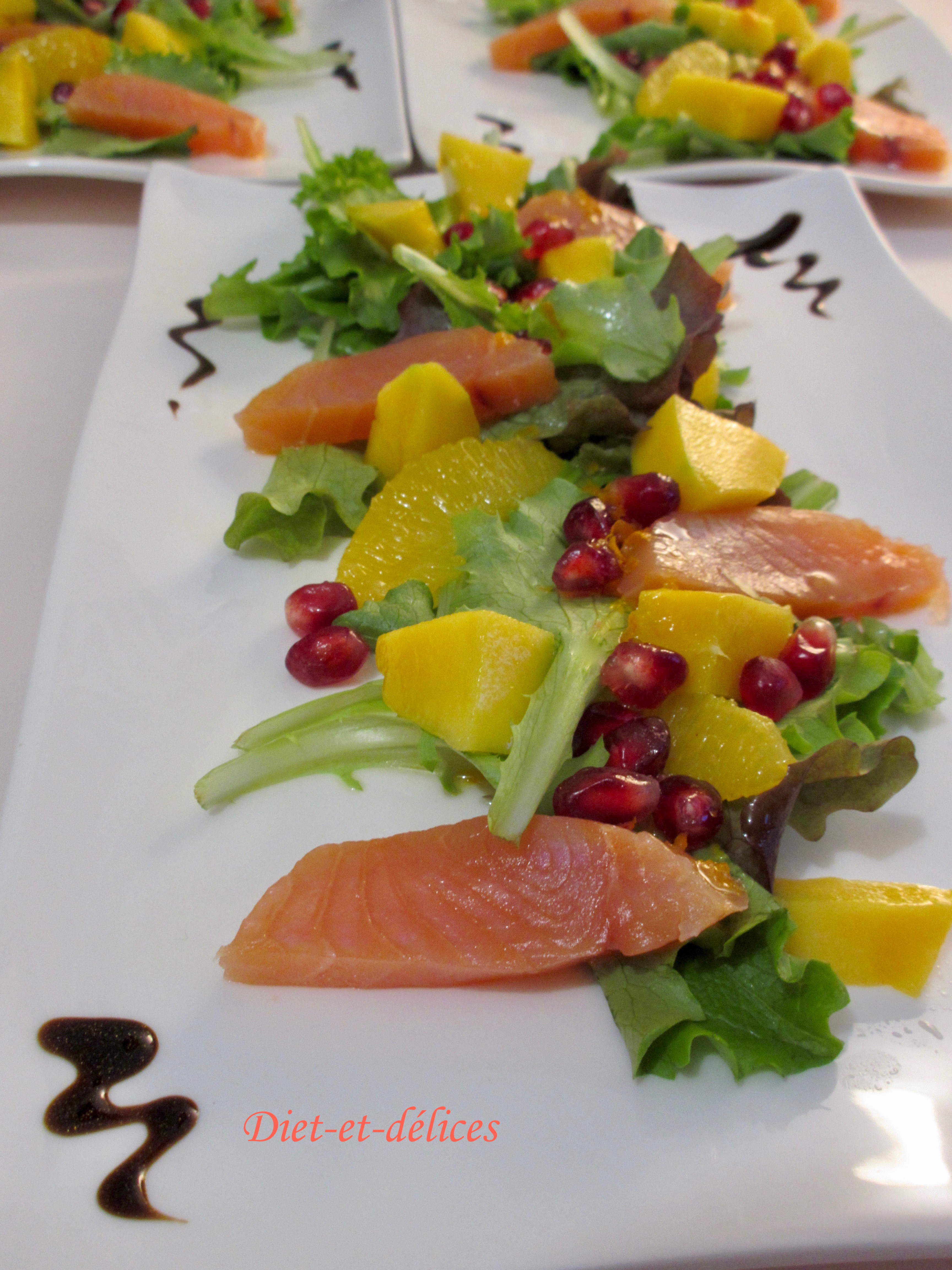 entrée, saumon fumé, poissonentrée froide, grenade, mangueoranges, sucré salé