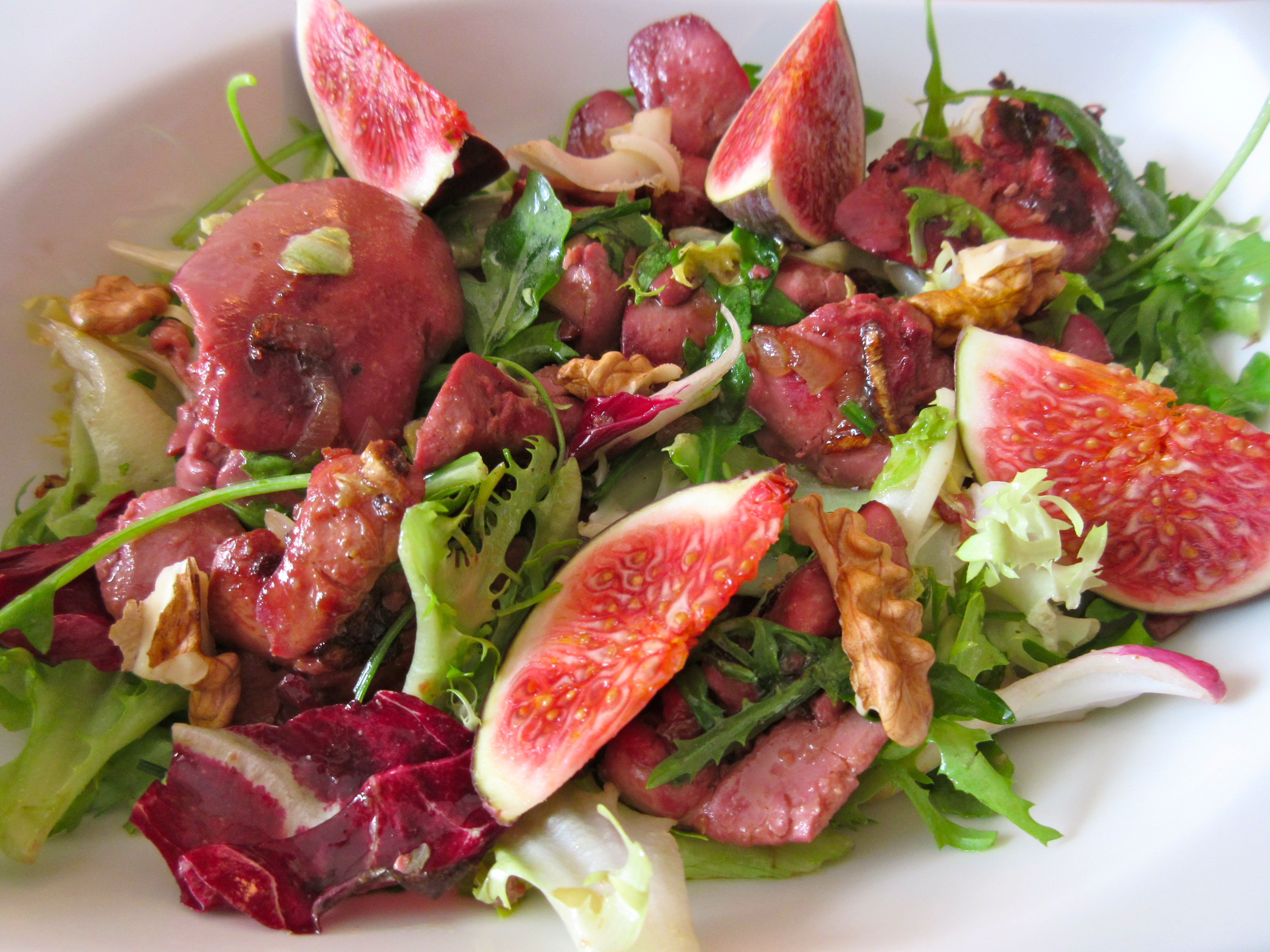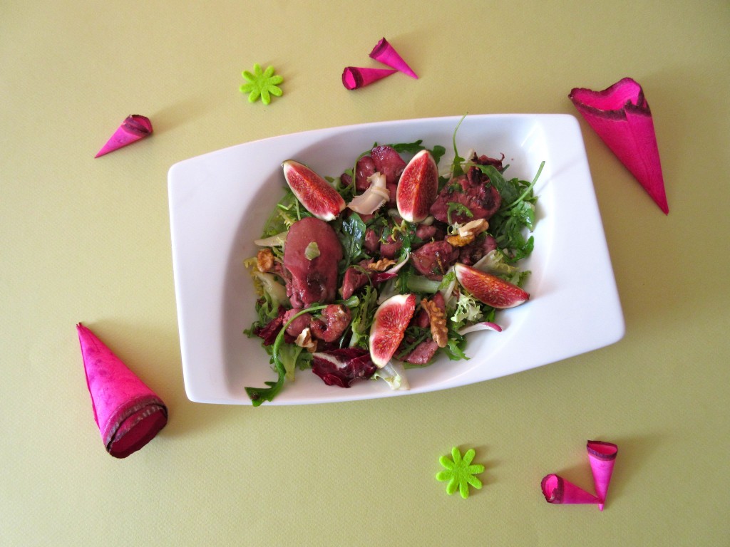 salade, salade à la figue , figue, foies, foies de volaille,abats, salade aux foies,salade gourmande, entrée, noix, salade complète, entrée festive