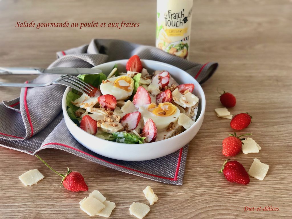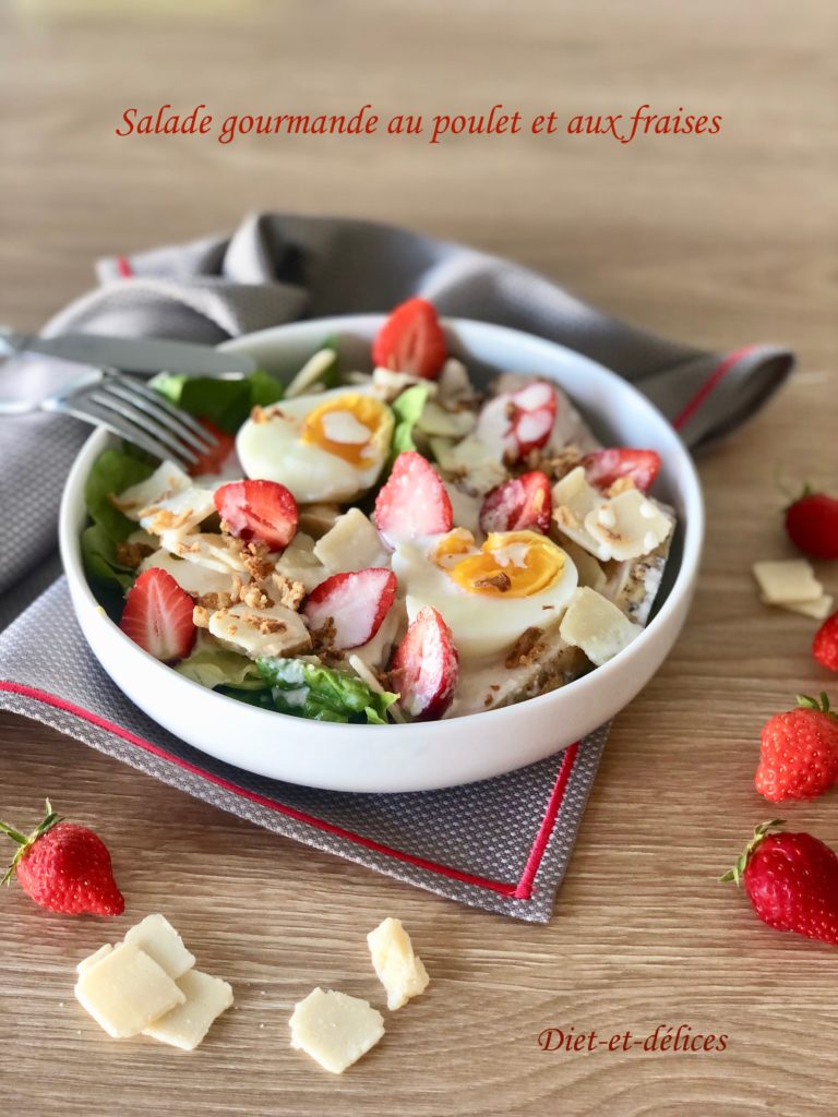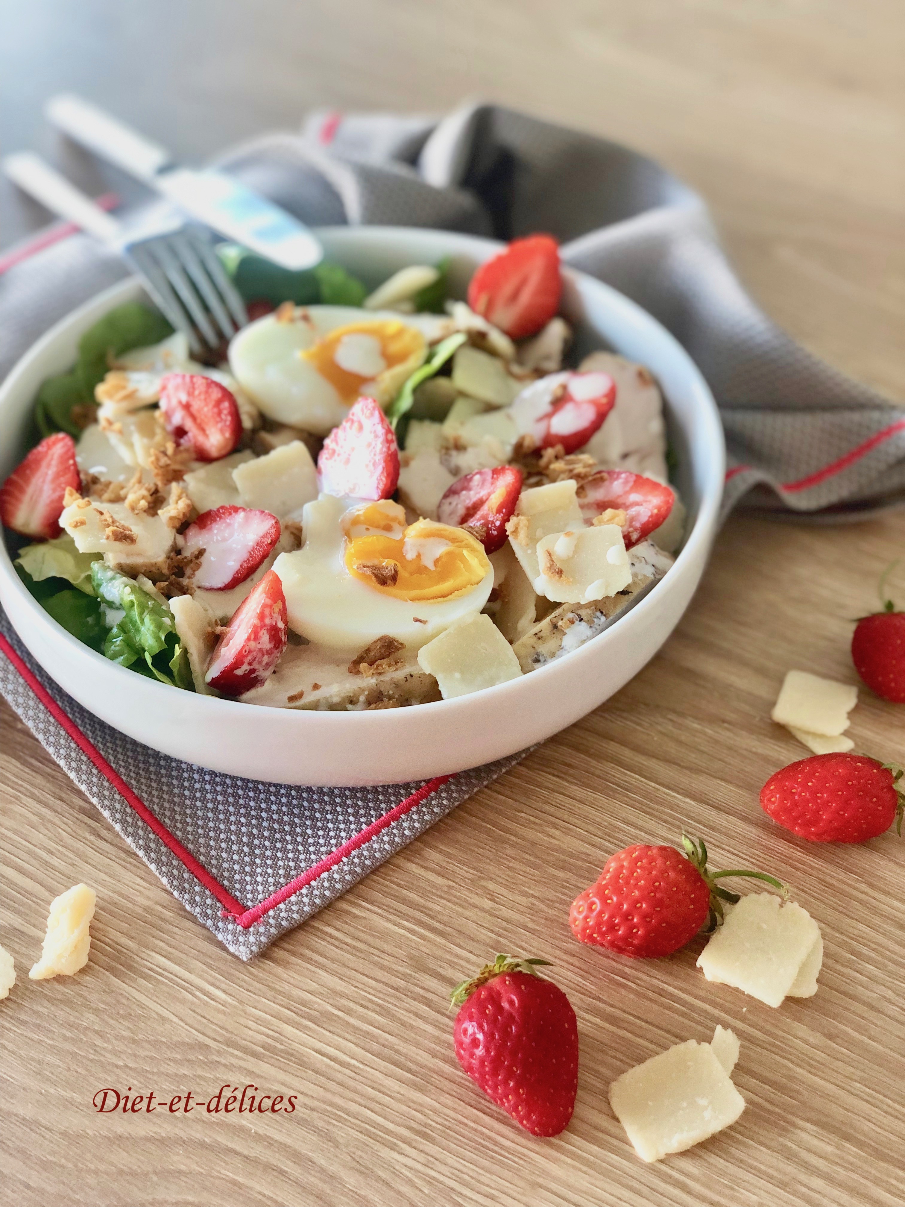 salade, salade composée, laitue, poulet, fraises, parmesan, sauce salade, oeuf, oignons frits