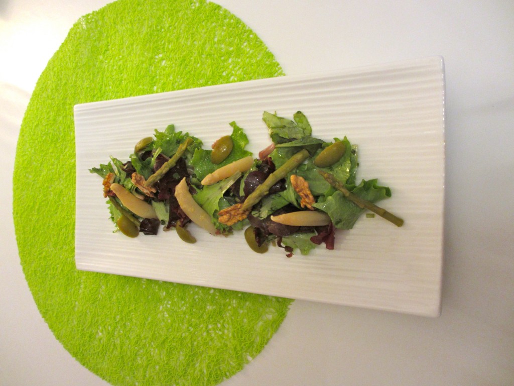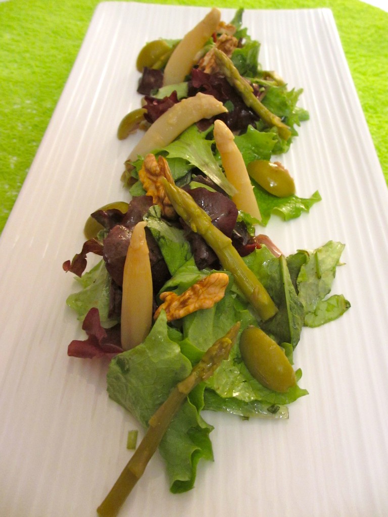 asperges, salade,noix, asperges vertes, asperges blanches, entrée, vinaigrette, moutarde,huile d’olive, vinaigre de vin, olives