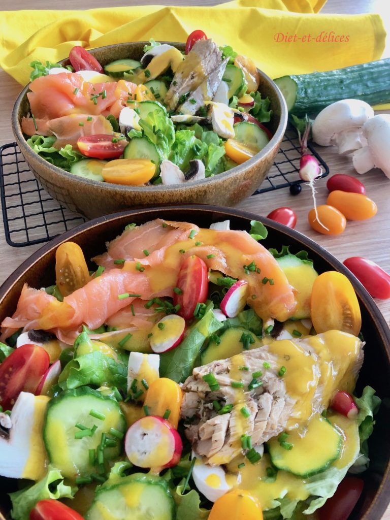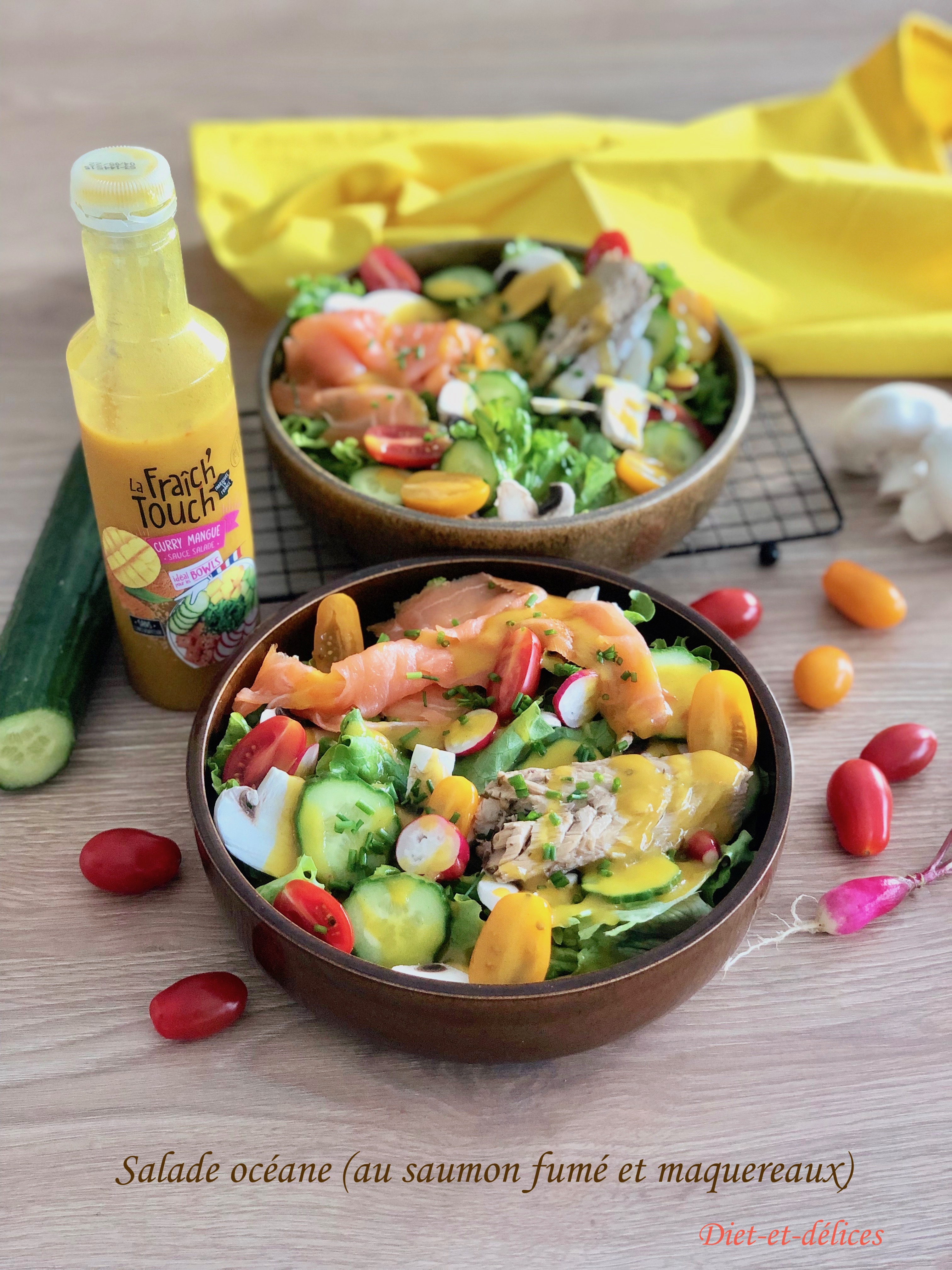 salade, salade océane, laitue , saumon, saumon fumé, maquereau, concombre, radis, tomates, champignons, salade de la mer, sauce salade