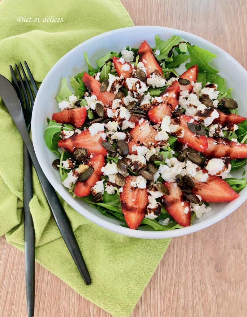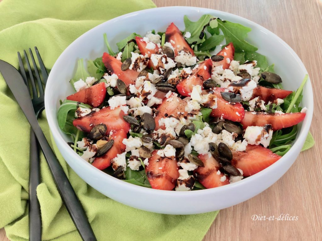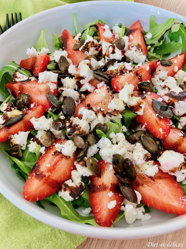 Le mélange fraise fromage est excellent, avec l’addition de la roquette et des graines de courges cette salade estivale est originale mais surtout délicieuse.