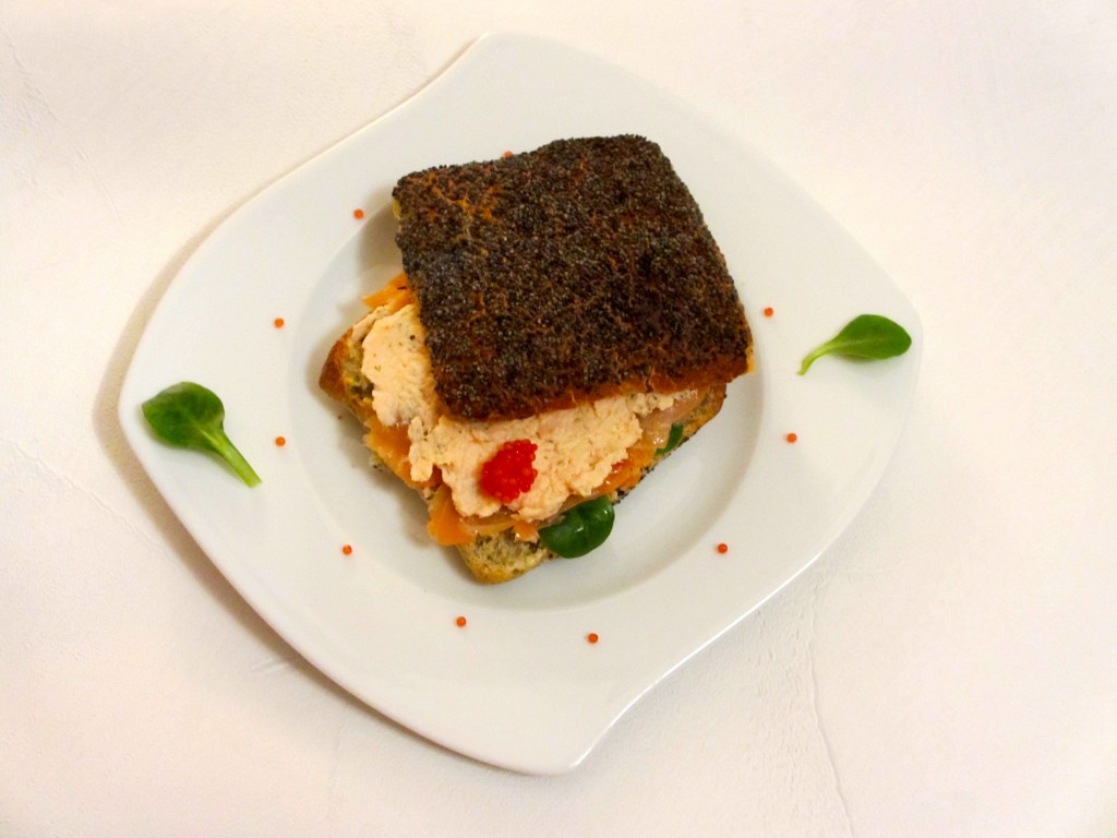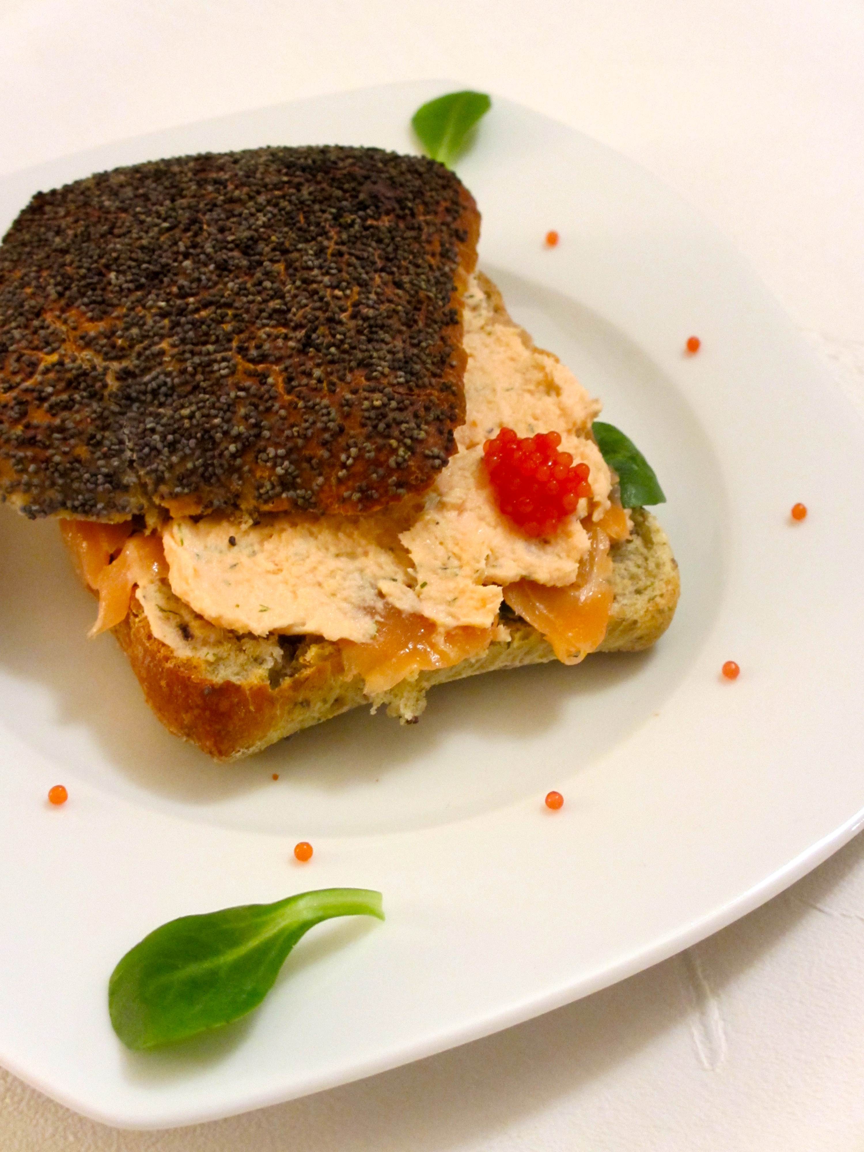 sandwich, sandwich au saumon, casse croûte, plat à emporter, rillettes, rillettes de saumon ,mâche, casse croûte au saumon, oeufs de lump, pain aux algues, aneth, saumon fumé , saumon, pain, pavot