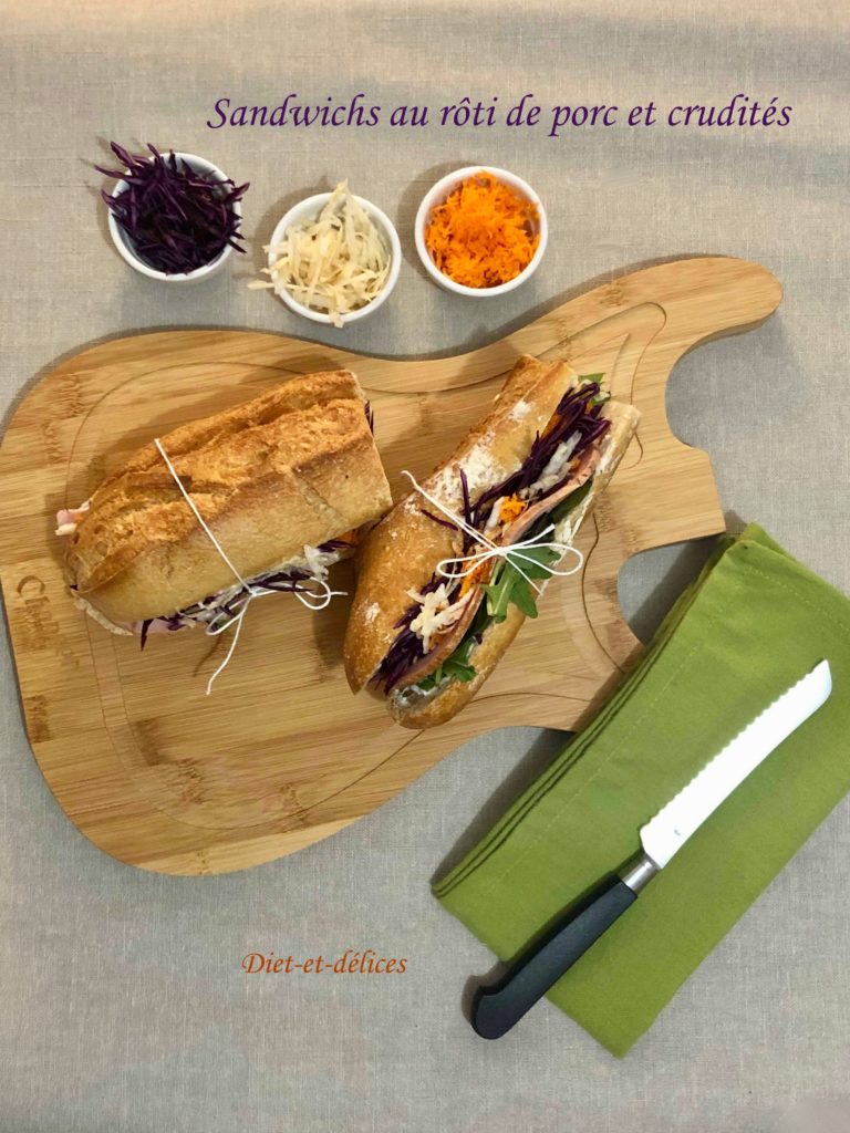 sandwich, rôti de porc, crudités, chou rouge, céleri rave, carotte, fromage blanc, moutarde à l’ancienne , baguette