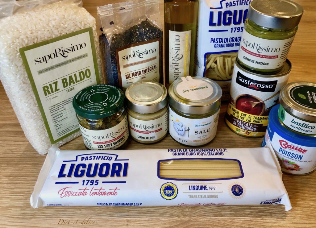 - – les produits salés : apéritifs et gressins, légumes à l’huile, huiles et condiments fins, pâtes, riz/risotto/polenta, sauces, poissons