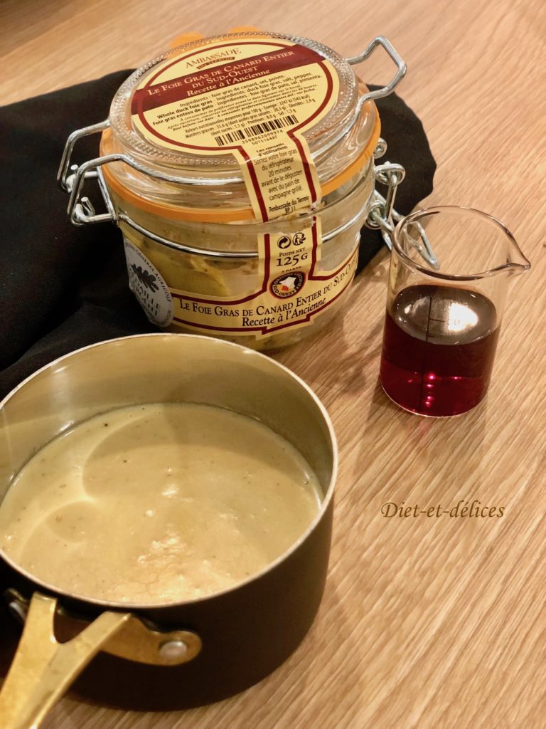 - Mettre à feu très doux afin de faire fondre le foie gras. Une fois qu’il est totalement fondu, ajouter le porto et le fond de veau.