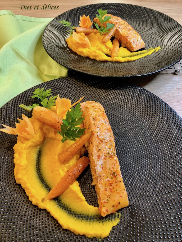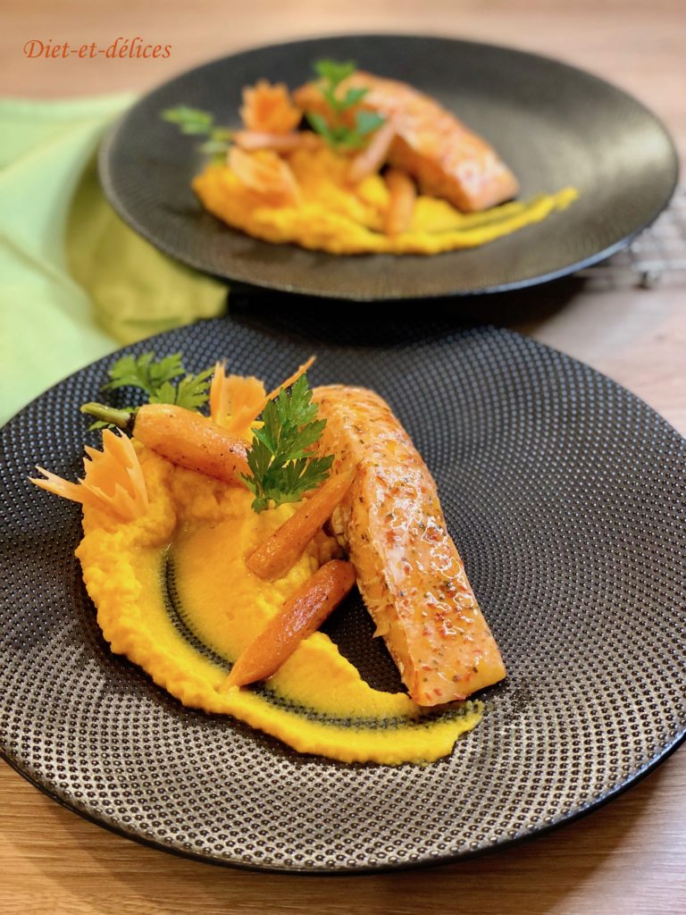 Une délicieuse assiette, avec un saumon parfumé et savoureux, accompagné des carottes, présentées sous trois façons différentes.