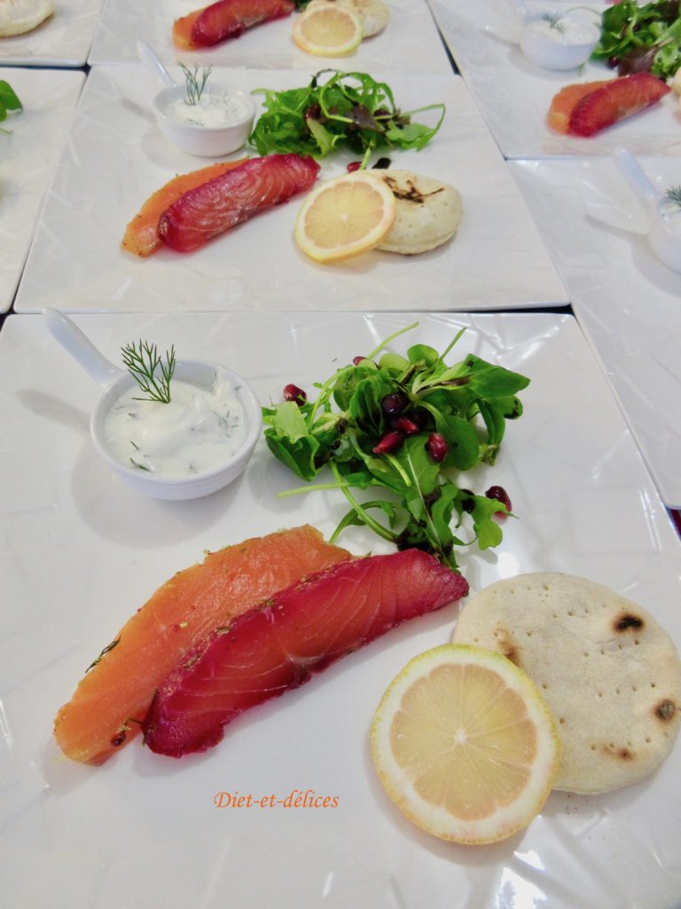 Idée géniale pour cette recette, c’est super aux niveaux des couleurs surtout lorsque le gravlax est préparé de deux façons différentes pour être présenté sur la même assiette.