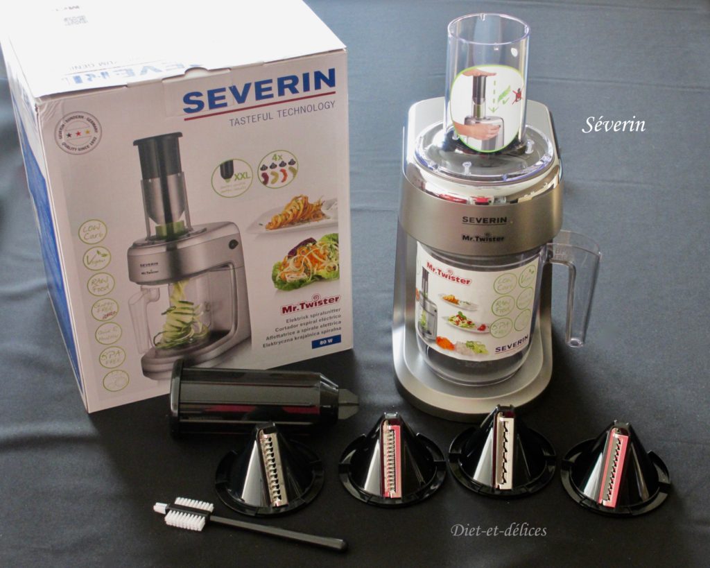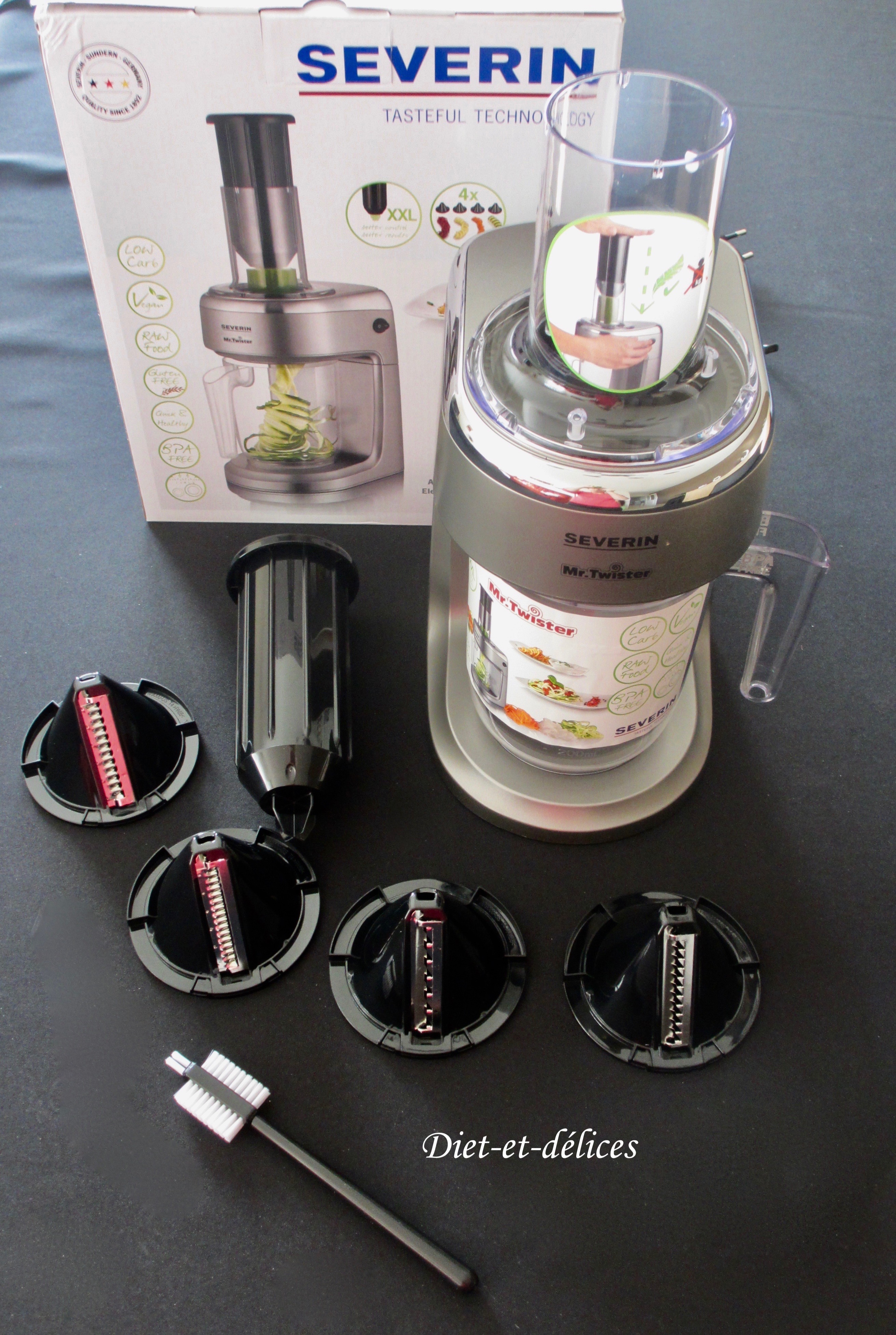 Je remercie grandement Séverin. J’ai eu le plaisir de recevoir un couteau spirale électrique pour légumes Mr Twist. Avec cet appareil, vous pouvez réaliser quatre sortes de pâtes de légumes. Les quatre lames permettent de réaliser d’ultra longues spirales de formes et de largeurs différentes : capellini de 3 mm, spaghetti de 5 mm, tagliatelles de 9 mm et papardelles extra large de 35 mm. Courgettes, carottes, pommes de terre, panais, concombres, patates douces, betteraves mais aussi poires, pommes, … vous pouvez facilement réaliser des spirales pour colorer vos assiettes.