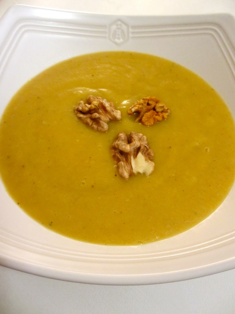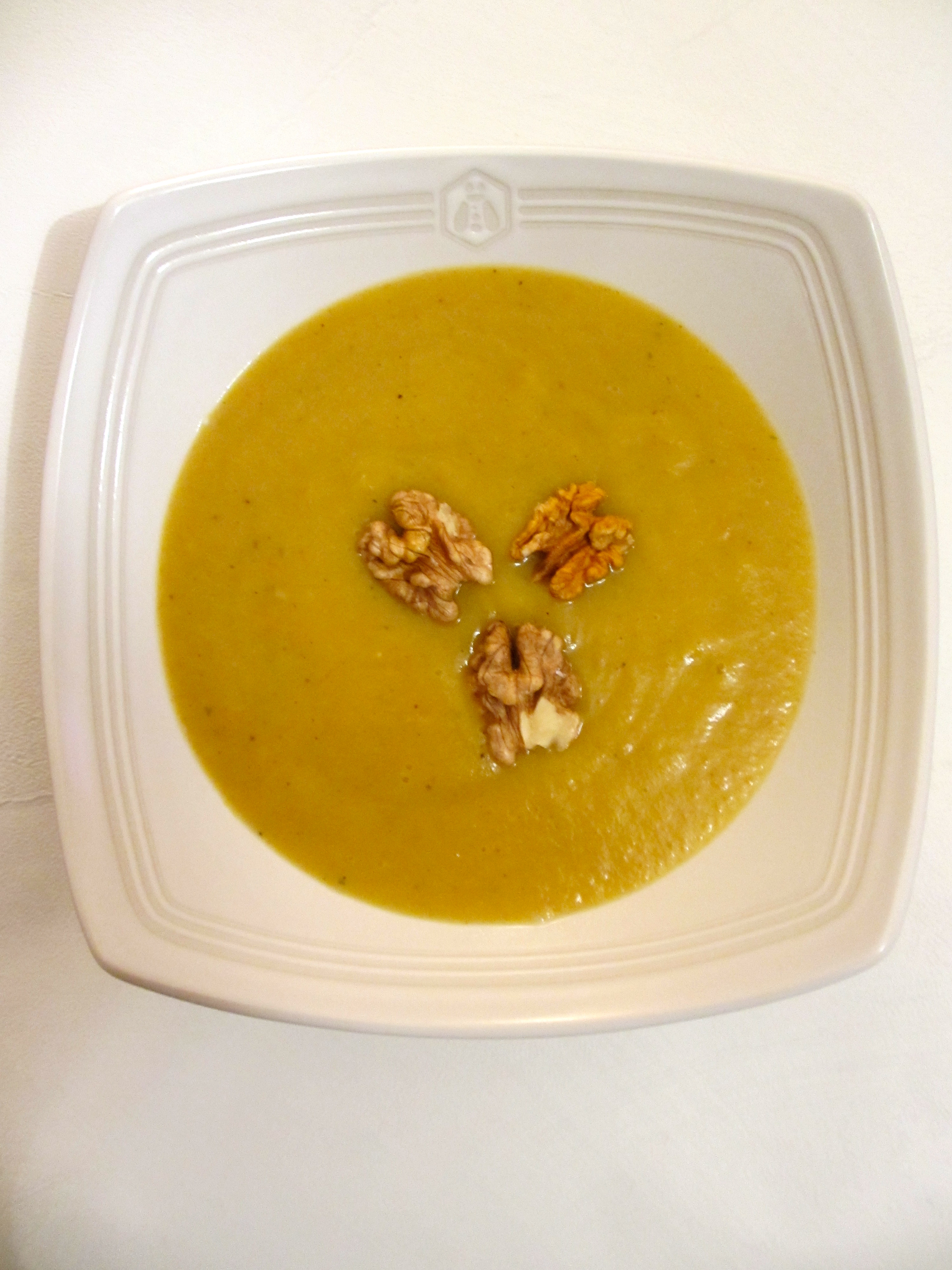 soupe, soupe hivernal, soupe aux légumes, velouté, velouté aux légumes, potage , légumes,poireaux, carottes, pommes de terre, oignon, noix , huile d’olive, épices, épices à tajine, diététique, cerneaux de noix