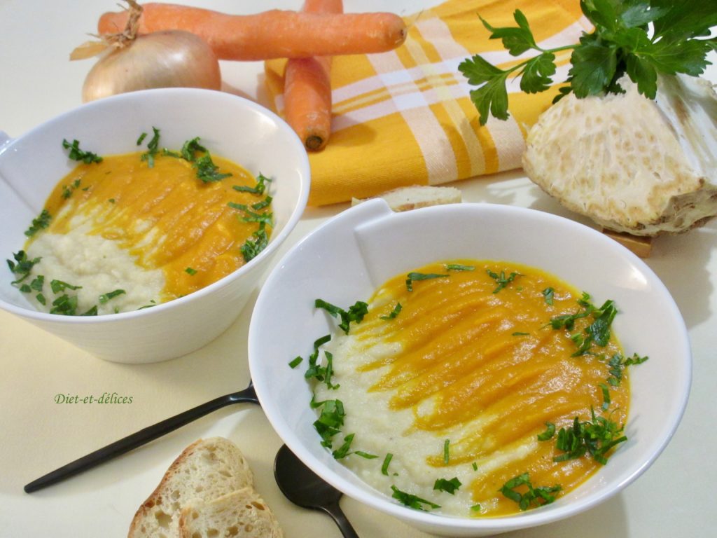soupe, végétarien, célerisoupe bicolore, carotte, oignonsoupe, soupe bicolore, célericarotte, oignon