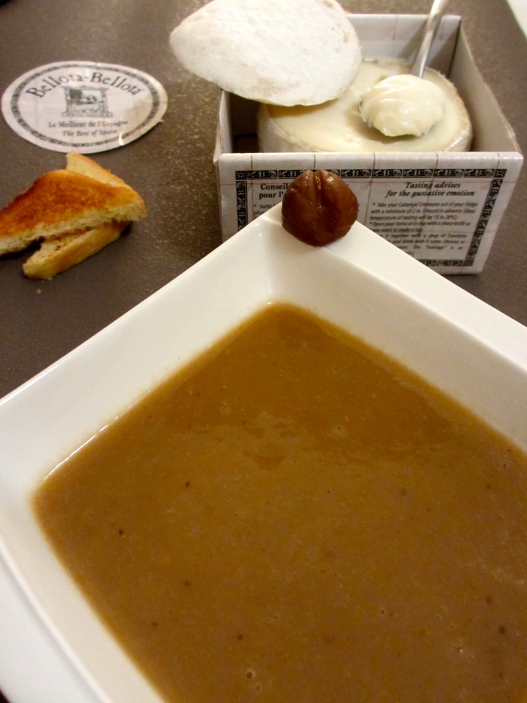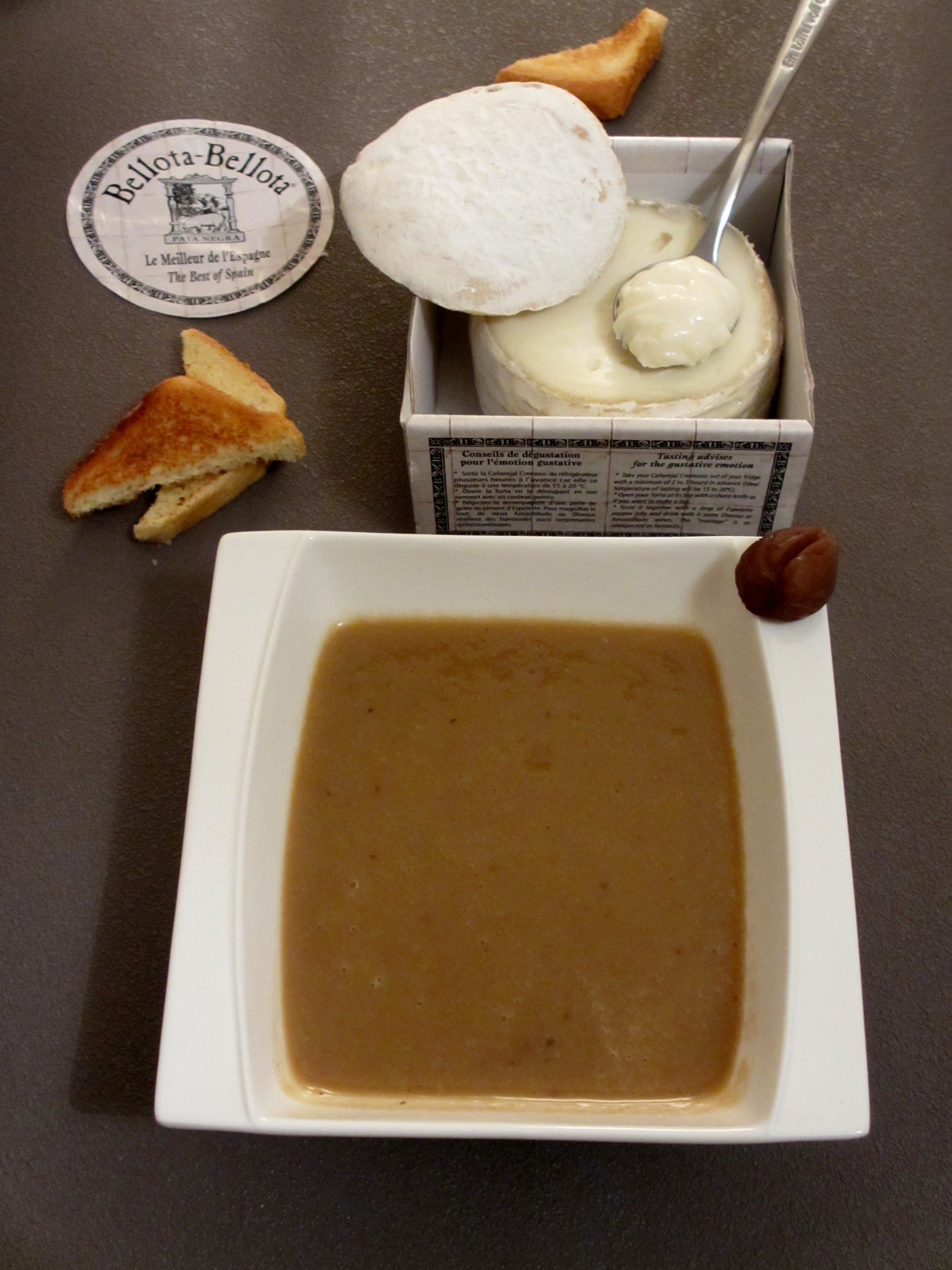soupe, soupe aux marrons, marrons, châtaignes, soupe de châtaigne, velouté, soupe hivernal,plat automnal, hiver, entrée, poireaux, fromage de brebis, torta, torta de salamanca