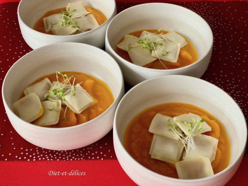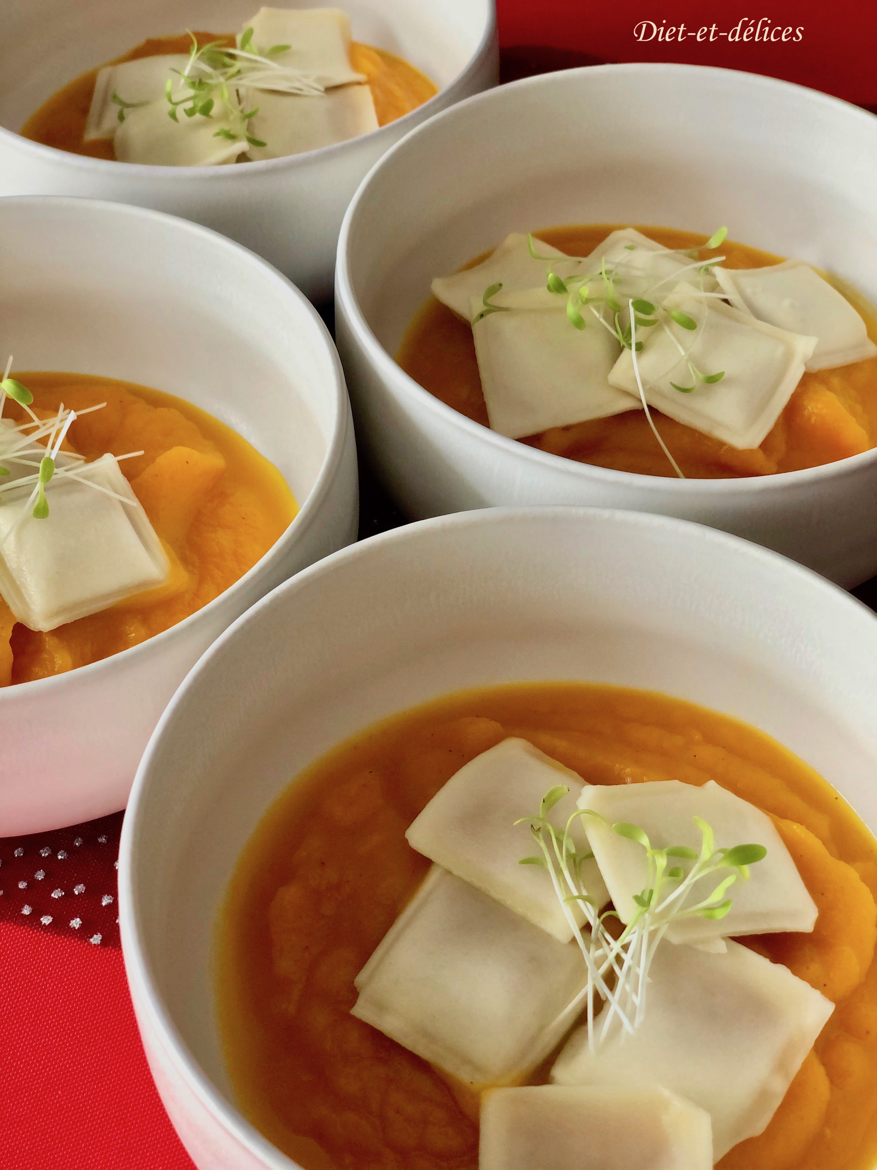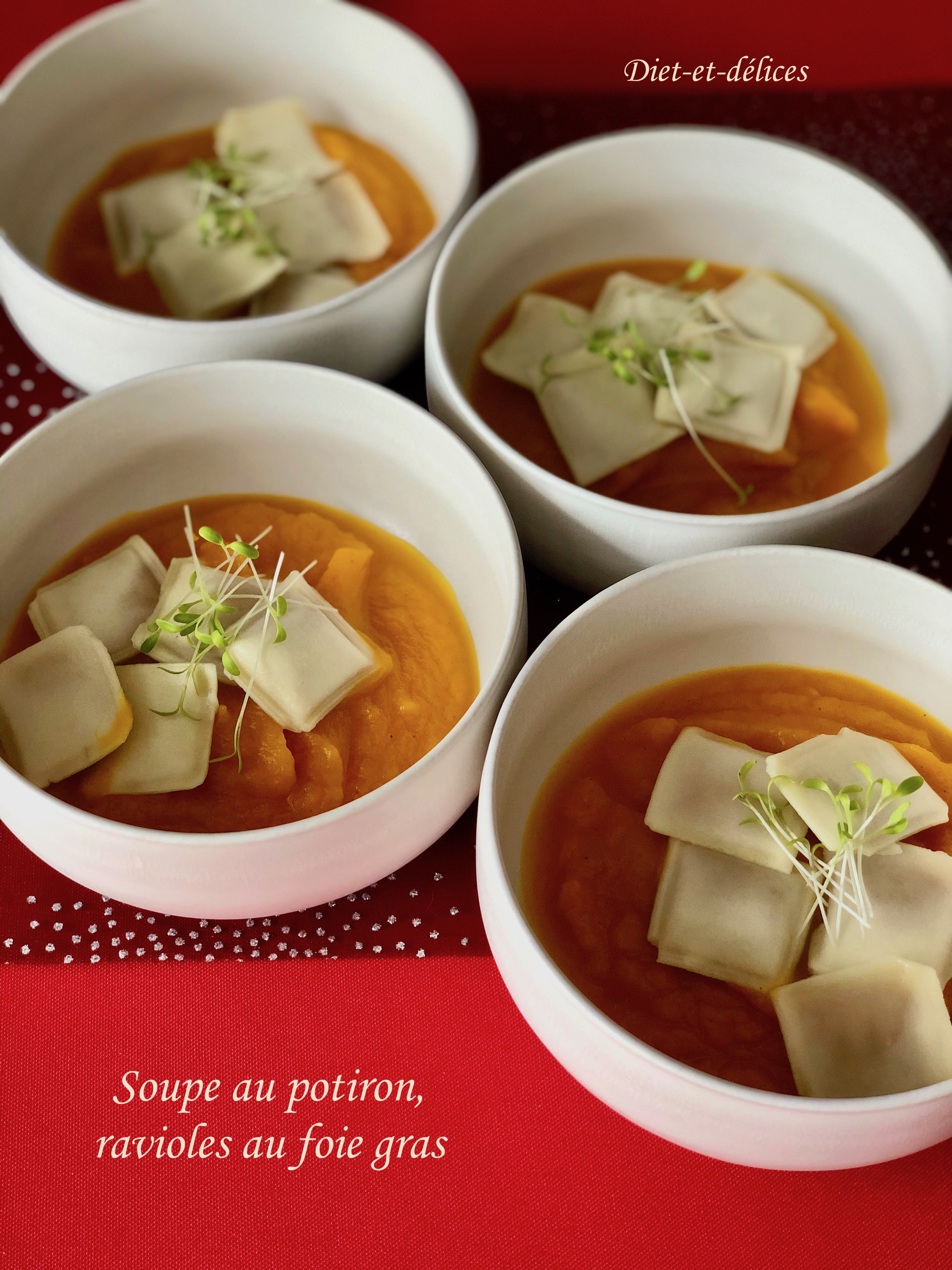 entrée, entrée chaude, soupe, ravioles, ravioles au foie gras, soupe au potiron, potiron