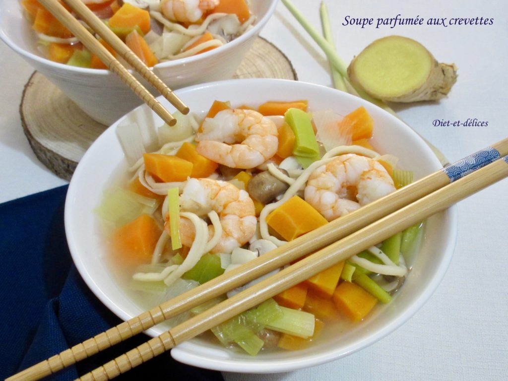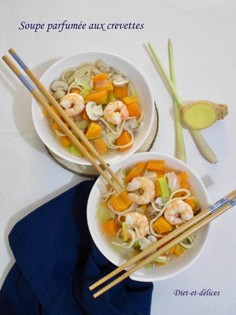soupe, bouillon, citronnelle, gingembre, céleri, crevettes, carottes, poireaux, nouilles chinoises
