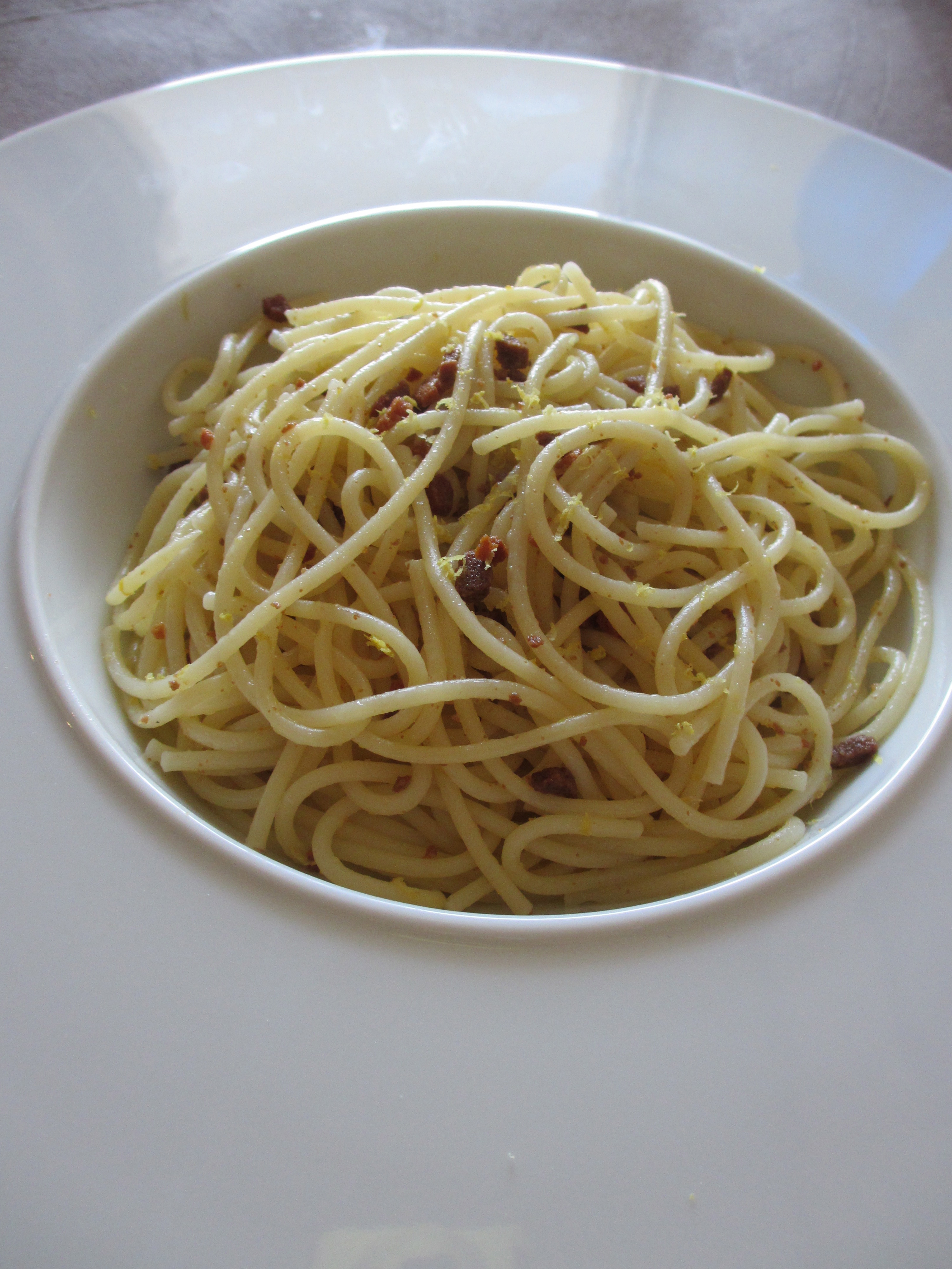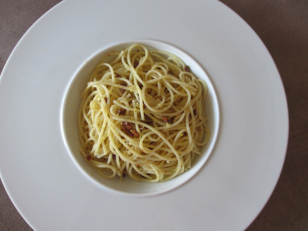 - Egoutter les pâtes et les faire revenir une à deux minutes dans l’huile d’olive chaude.