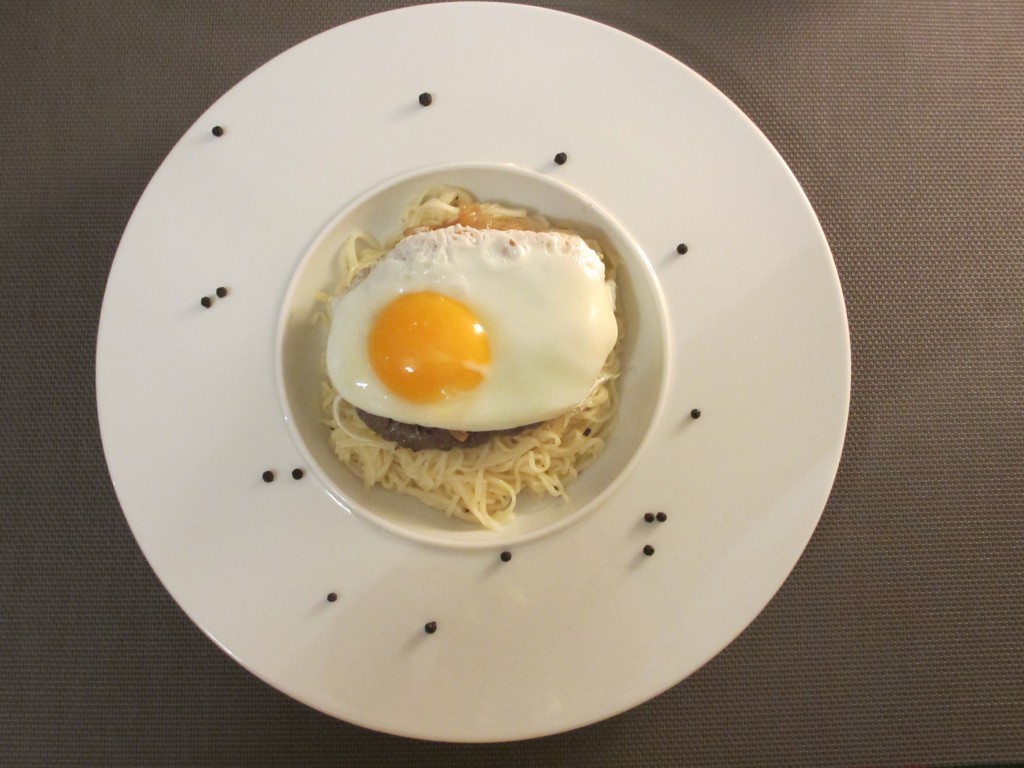 - Dresser sur une assiette en superposant le steak, les oignons, puis l’oeuf au plat.