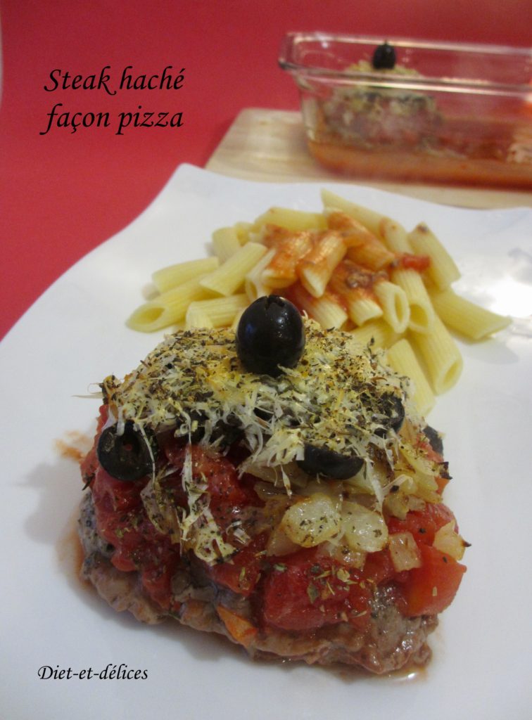 steak , steak haché, boeuf, steak façon pizza, steak haché façon pizza, tomates, olives, origan, ossau-iraty