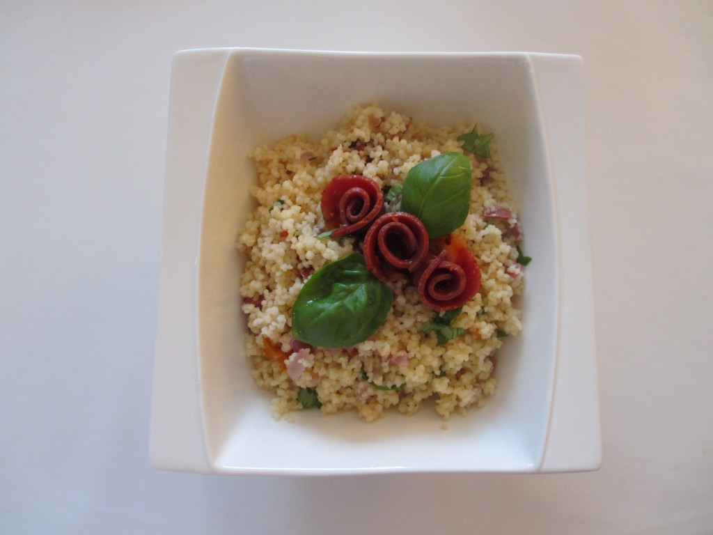 taboulé, magret de canard, semoule, magret, piment, keufta, basilic, vinaigre de tomates