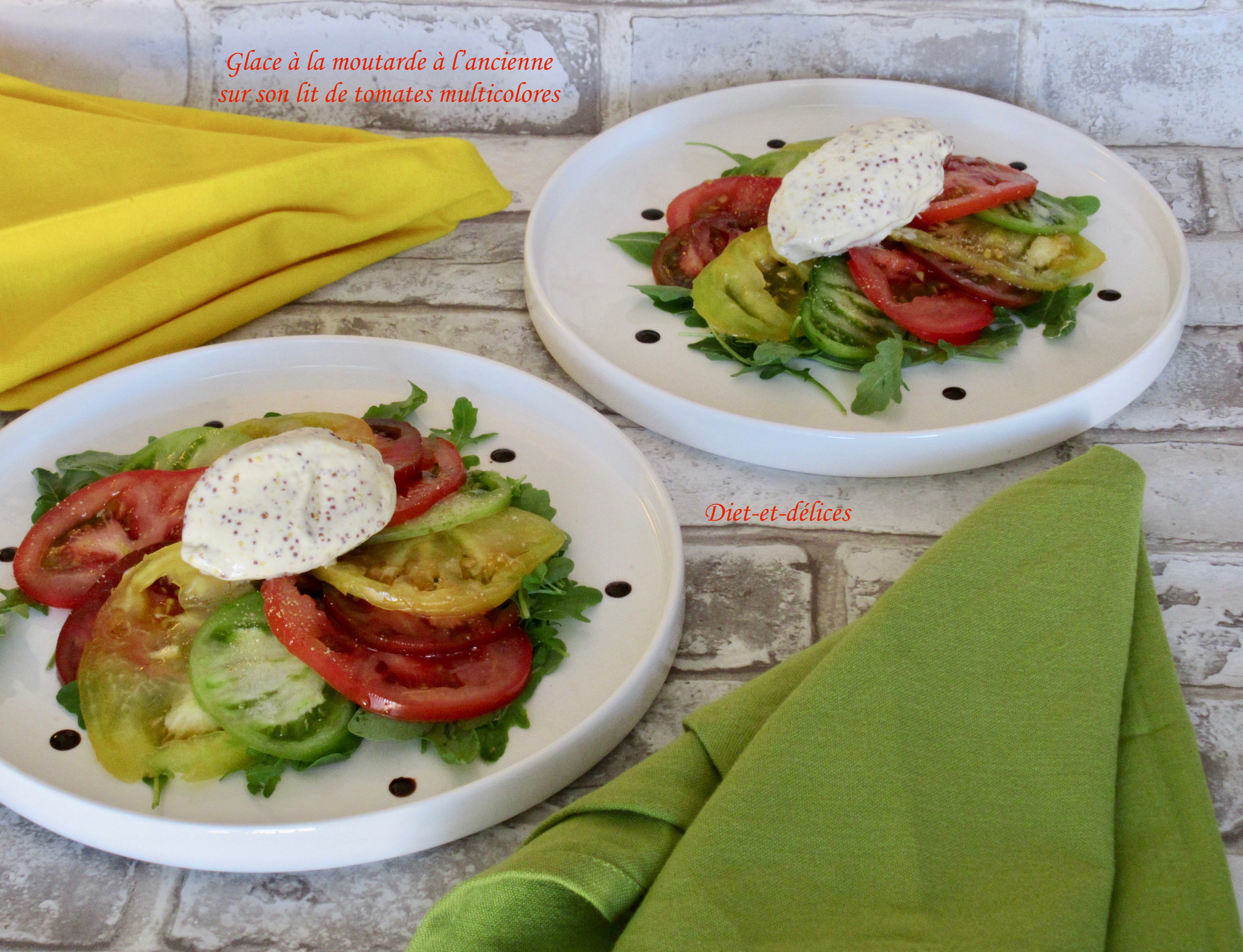 Glace à la moutarde à l’ancienne sur son lit de tomates multicolores