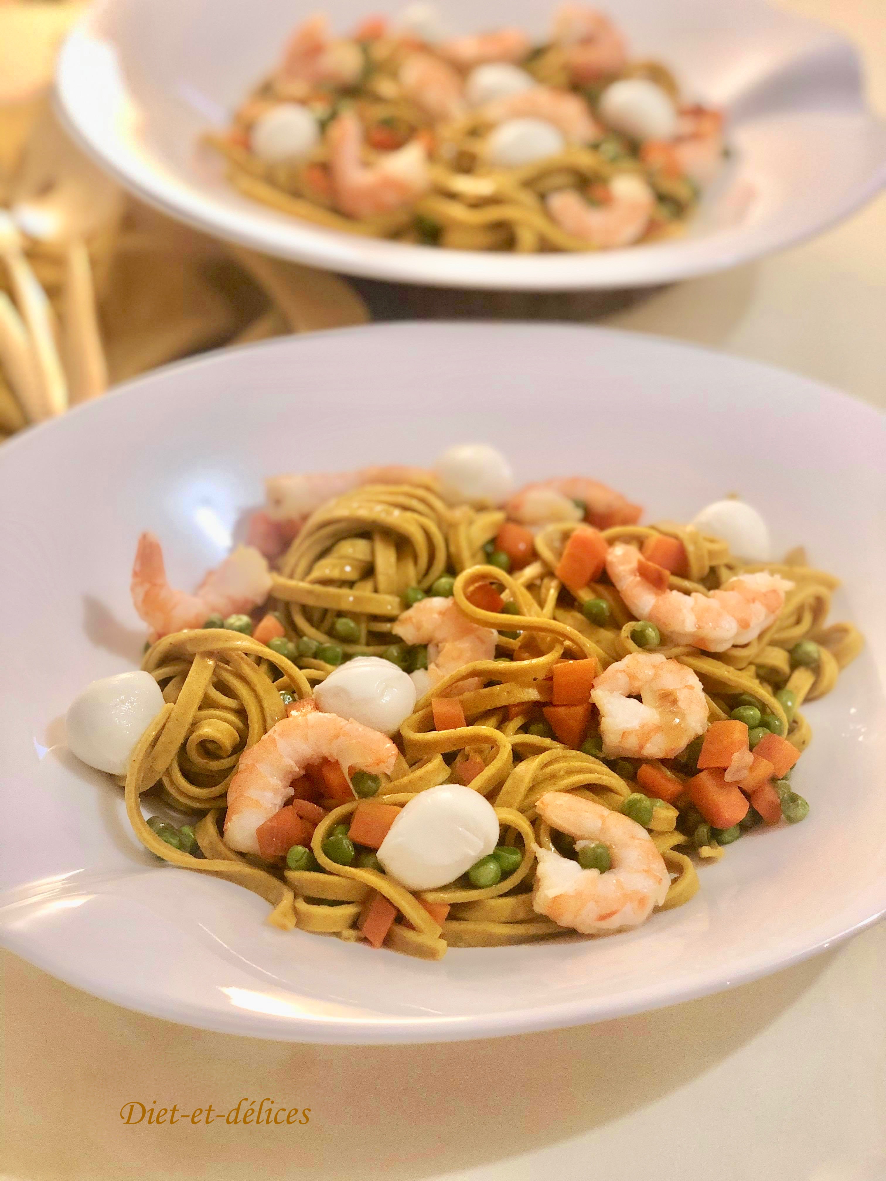 tagliatelles, pâtes, crevettes, plat complet, petits pois, carottes