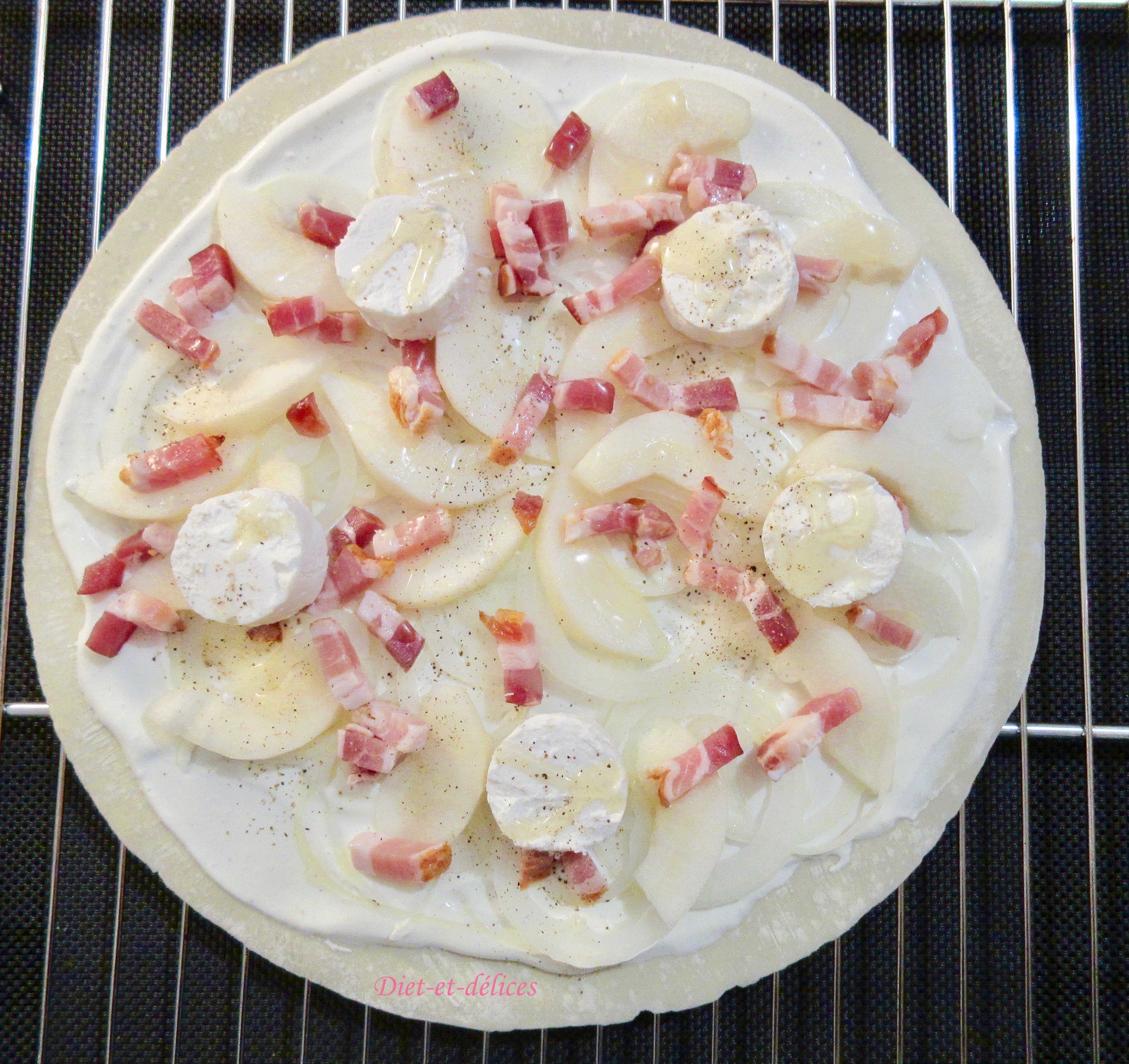 - Répartir les oignons émincés, les lamelles de poire et les lardons.